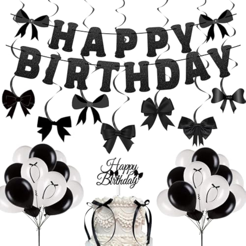 | Package - The Black Bow Party Decorations Include 1Pcs Happy Birthday Banner, 7Pcs Black Bow Hanging Swirls, 10Pcs Black Balloons And 10Pcs White Balloons. 1Pcs Glittering Happy Birthday Cake Topper,1 Roll You Can Diy It As Bow Decor Black Satin Ribbon Our Bow Party Decorations Can Meet Your Party Needs. | | Materials - This Black Bow Banners, Cake Topper,Swirls Are Made Of Cardstork Paper. Balloons Are Made Of Latex. Product Size Are Shown In The Picture. | | Party Decor - Our Bow Party Decorations Are Suitable For Bow Girl Birthday Party, Coquette Birthday Party, Bow Party Decor, Baby Shower, Bridal Shower, Wedding, Bachelorette Party And More. | | Easy To Assemble - Our Bow Theme Party Decorations Are Quick And Easy To Assemble. Latex Balloons Are Easy To Inflate, Which Is Convenient, Saving Your Time, So That You Can Concentrate On Enjoying The Good Time Of The Party. | | Bow Theme - Our Birthday Banner, Hanging Swirls And Balloons Are Designed With Classic Bow Elements. With The Popular Design, It'S Sure To Be A Hit With People. | |