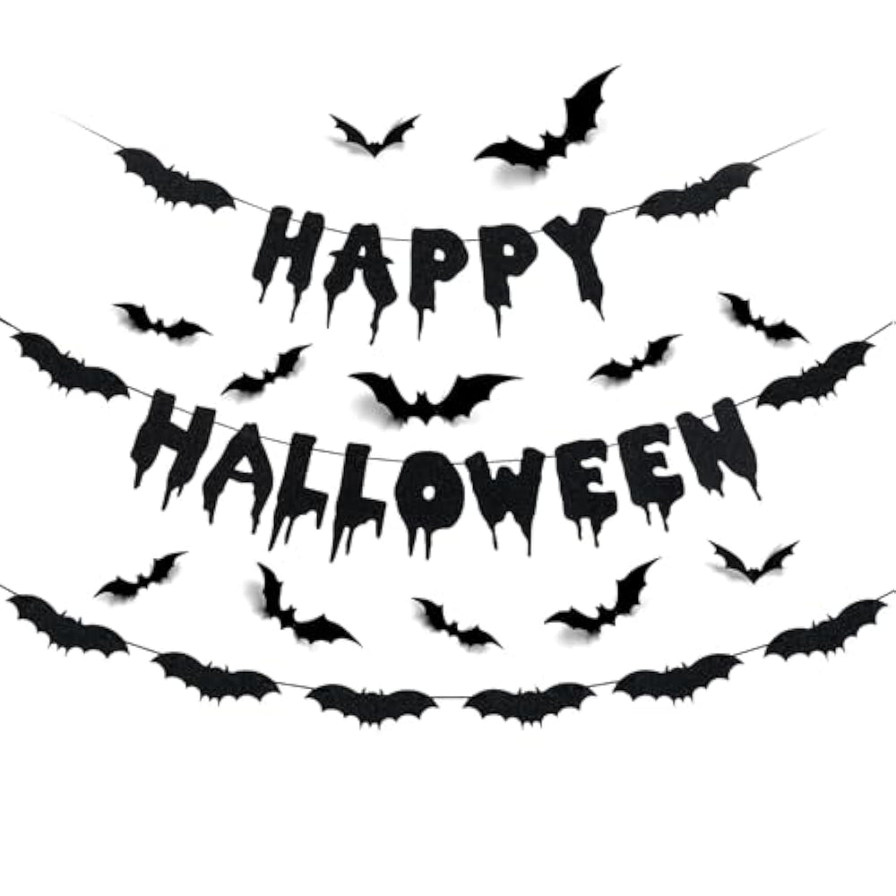 This Halloween decoration set includes 1 black glitter “Happy Halloween” banner, 1 bat banner, and 12 bat wall decals, creating a spooky and festive atmosphere for your party. Perfect for Halloween parties, Hocus Pocus-themed birthdays, or vampire and zombie party scenes, these decorations can be displayed on doors, windows, branches, backyards, or walls to enhance the creepy ambiance. The set comes with a needle and ribbons for easy stringing, requiring minimal DIY effort. Ideal for hanging over dessert tables, backdrops, ceilings, or any party space, this set adds a cohesive, eye-catching touch to your Halloween celebration.