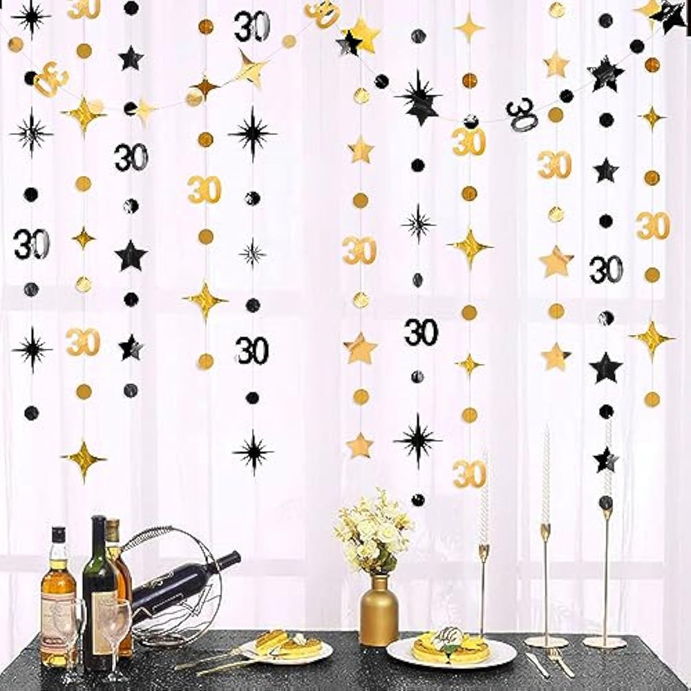Celebrate turning 30 in style with this 46-foot Black and Gold Garland Set, perfect for men and women. The set includes 4 pre-strung garlands (11.5 feet each) featuring shimmering stars, circles, and the number "30," made from high-quality double-sided metallic cardstock. Durable, reusable, and easy to hang, these twinkle garlands add sparkle to any "Dirty 30," "30 & Fabulous," or "Cheers to 30 Years" celebration. Ideal for indoor or outdoor décor—hang them on walls, windows, dessert tables, trees, or fences to elevate your birthday or anniversary setup effortlessly.