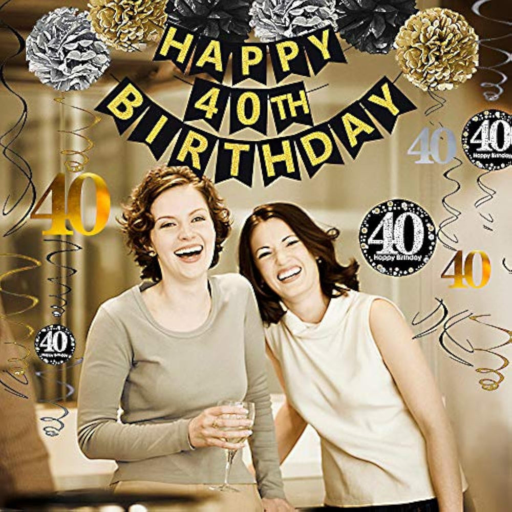Celebrate in style with this Black & Gold 40th Birthday Decoration Set! The package includes a pre-assembled glittery "HAPPY 40th BIRTHDAY" banner, 12 sparkling 40th hanging swirls, and 6 tissue paper pom poms (2 gold, 2 black, 2 silver). Made from high-quality, eco-friendly paper, these decorations are sturdy, reusable, and perfect for marking a milestone 40th birthday or anniversary. With elegant colors and easy setup, this kit adds a classy, festive touch to your celebrations.