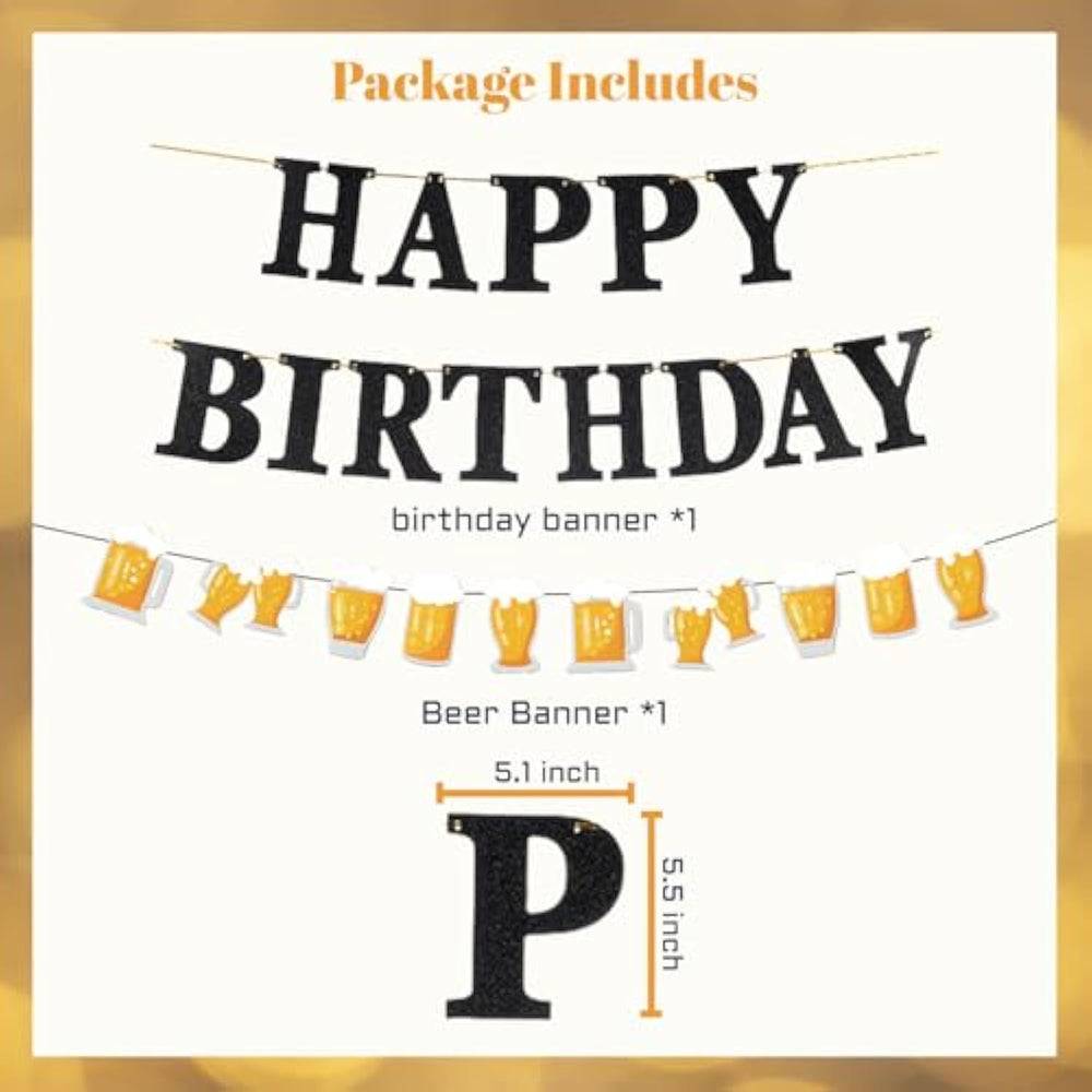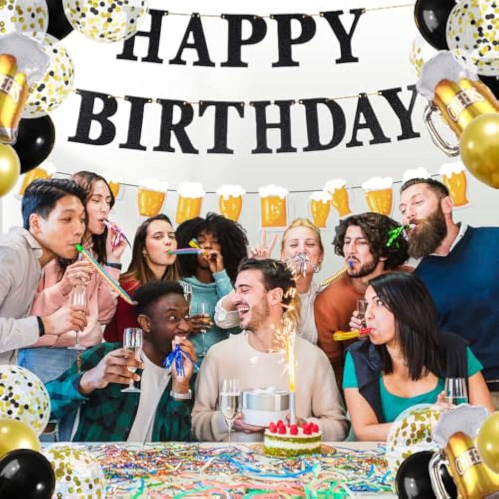 | Birthday Party Decorations Set Include:1X Happy Birthday Banner,1X Beer Banner,30X Latex Balloons(10 Black, 10 Gold, 10 Confetti Balloons,6X Beer Balloon,These Balloon Perfect For Decorate Birthday Party. | | Materials:Our Birthday Banner Are Made Of High-Quality Paper,Beer Balloon Are Made Of Durable Aluminum Foil,Latex Balloon Are Made Of High-Quality Latex. | | Easy To Assemble:Birthday Decorations Set With Ribbon And Tape To Help Assemble,You Can Hang It On The Door, Window, Wall Or Anywhere At Party,Also As A Photo Backdrop And Party Sign,Add Some Character To Your Party. | | Multiple Applications:Our Beer Birthday Party Decorations Are Suitable For Various Occasions,Not Only For Cheer And Beer Parties And Beer Themed Party,But Also For Birthday Party,Vintage Party,Anniversaries And Other Themed Parties Etc. | |