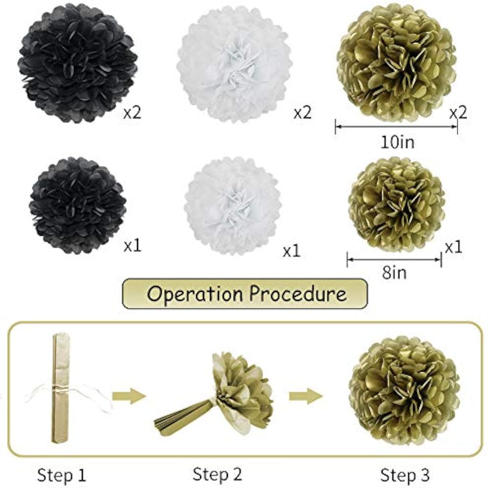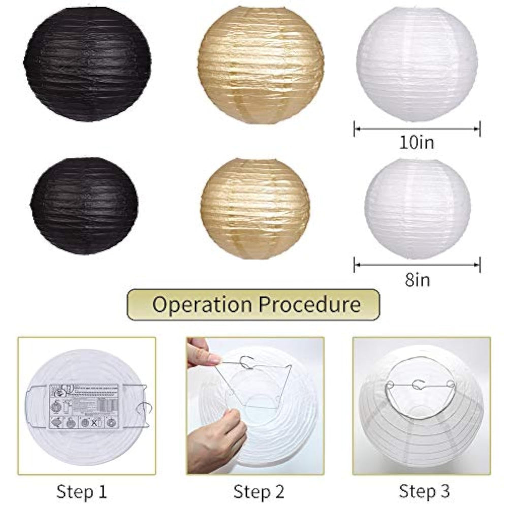 | Black And Gold Party Decoration Set Includes: 1Pc 8Inch+1Pc 10Inch Black Paper Lanterns, 1Pc 8Inch+1Pc 10Inch Gold Paper Lanterns, 1Pc 8Inch+1Pc 10Inch White Paper Lanterns, 1Pc 8Inch+2Pc 10Inch Black Tissue Pom Poms, 1Pc 8Inch+2Pc 10Inch Gold Tissue Pom Poms, 1Pc 8Inch+2Pc 10Inch White Tissue Pom Poms. Black, White And Gold Paper Lanterns And Paper Pom Pom Decorations Add A Festive Touch To Any Themed Birthday Party. | | Perfect Decoration: Black And Gold Party Decorations Set Good For Black And Gold Birthday Decorations, Graduation Party Decorations, Retirement Party Decorations, Masquerade Party Decorations, New Years Party Decorations Or Any Other Black And Gold Party Theme Decorations Celebration. | | Wide Use: These Gold And Black Party Decorations For Classroom, Office Decor, Indoor Outdoor Party Decorations, Also Great For Ceiling Wall Garden Decorations Or Any Decorations For Black And Gold Party. Use This Set Of Black And Gold Party Decorations As A Birthday Party Backdrop To Create Lasting Memories. | | Easy Assembly Required: Instructions Are Included With The Product And Available Online. Paper Lanterns Are Easy To Assemble And Hang, The Tissue Flowers Take A Little Patience To Open But Are Well Worth The Reward. You Can Enjoy Diy Moments With Your Children. They Will Have Fun Decorating With This Set. | | Product And