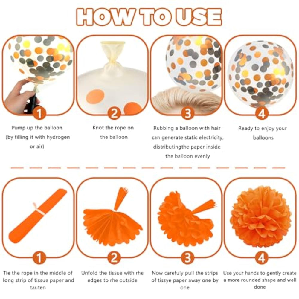 This set includes paper fans, orange and black pompoms, star and heart foil balloons, a paper garland, black and orange balloons, confetti balloons, a balloon strip, and glue point stickers, offering everything needed for a festive setup. The fans and pompoms come flat-packed with instructions and ribbon for easy fluffing and hanging, while hooks make swirls simple to display on walls, ceilings, or doorways. Made from high-quality materials, the decorations are reusable, durable, and easy to store. Perfect for Halloween, birthdays, graduations, weddings, showers, or festivals, this kit creates a vibrant black and orange party backdrop for any celebration.