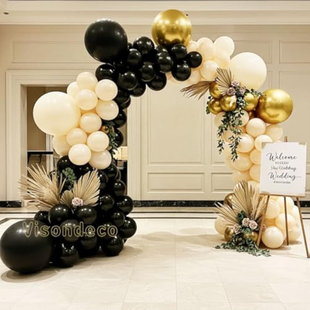 | Elegant Color Palette For Milestone Moments - Includes 65 Pcs Double Balloons In Black, Ivory And 16 Pcs Gold Balloons, (146Pcs Balloons In Totally): Black (18”×1, 12”×25, 5”×10), Ivory (18”×1, 12”×28, 5”×10), And Metallic Gold (18”×1, 12”×10, 5”×5). Ideal For Upscale Parties And Backdrops.Also Fits Searches For Black And Gold Balloons, Black Balloon Arch Kit, Champagne Balloon Arch Kit, And Cream White Balloon Garland. | | Perfect For Birthdays, Graduation, Retirements More - Celebrate With Style—Whether It’S A Birthday Bash, Graduation, Retirement Toast, New Years Party Decorations, Or Anniversary Dinner.Works Beautifully For New Years Party Decorations, Anniversary Decorations, And Elegant Luxury Party Backdrops. | | Double Stuffed For Deep, Rich Colors - Dual-Layer Latex Balloons Provide Vibrant, High-Impact Color Without Transparency. Enjoy That Luxurious Look In Photos And Real Life. Ivory/Cream White Balloons And Black Balloons Options Blend Seamlessly With Off-White Or Cream Décor. | | Pro Setup Tips For Best Results - Inflate Balloons To 85–90% Capacity To Maintain Shape And Reduce Popping. Slight Color Variation After Inflation Is Normal And Enhances The Natural Matte Or Metallic Look. | | Pro Setup Tips For Best Results - Inflate Balloons To 85–90% Capacity To Maintain Shape And Reduce Popping. Slight Color Variation After Inflation Is Normal And Enhances The Natural Matte Or Metallic Look. | |