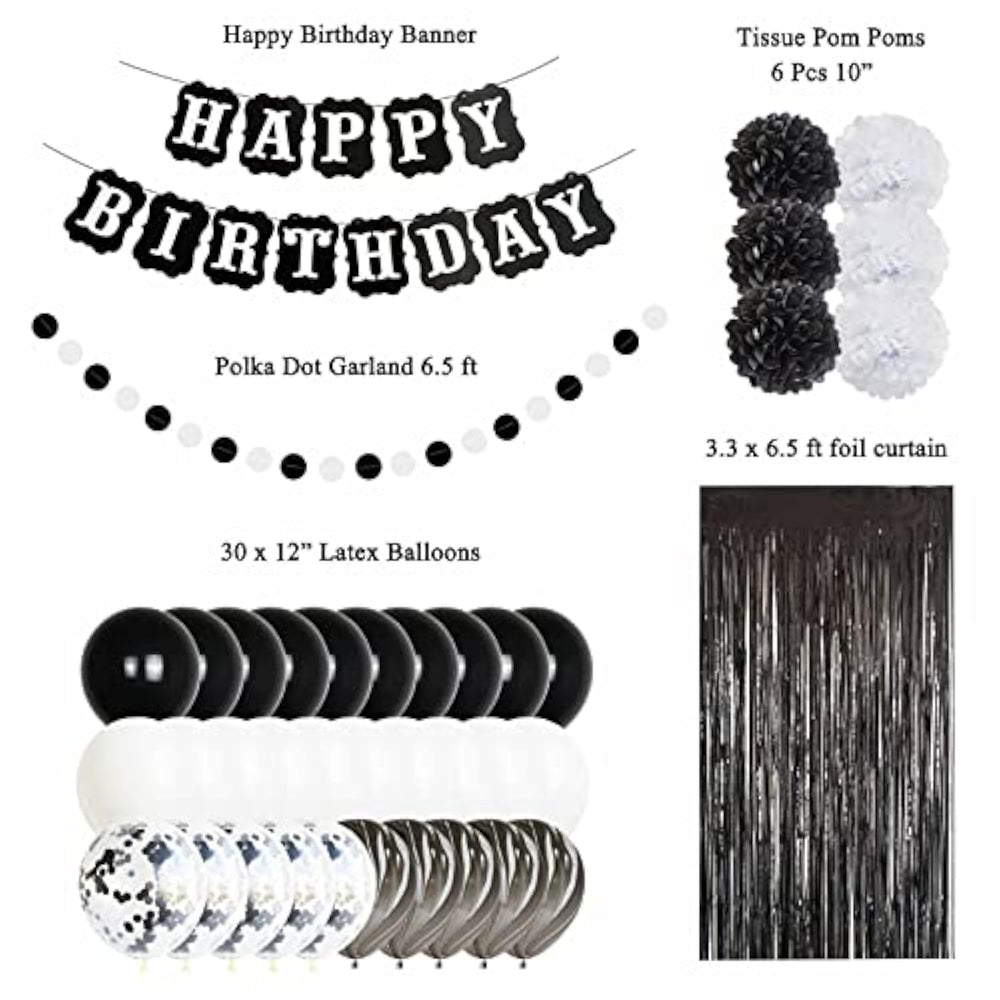 Celebrate in style with this elegant black and white birthday decoration set, perfect for both men and women. The set includes a classic "Happy Birthday" banner with matching satin ribbon, a 6.5 ft polka dot garland, and 30 premium 12" balloons in black, white, confetti, and marble designs. Add a touch of sparkle with a large 3.3 x 6.5 ft black foil fringe curtain—ideal for backdrops or door décor. Complete with tissue pom poms and ribbon, this all-in-one kit brings a clean, stylish look to any birthday celebration.