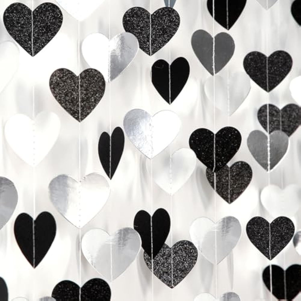 | ?Package Including?The Party Garlands Includes 4 X Silver Black Paper Garlands, Each Backdrop Bunting Is 13 Feet/ 4 Meters Long, Total Length Is 52 Feet/ 12 Meters. Every Banner Has 40Pcs Hearts Which The Size Is 1.97” | | ?High Quanlity?The Material Of The Party Streamers Is Eco-Friendly Paper And Double Sided Gittler .You Can Cut To Any Length You Want If You Need Shorter Length Than 4M And The Paper Won'T Fall Apart Because Of The Cut. | | ? Easy To Assemble ?Just Open The Package To Hang It Directly Because They Have Been Sewn Together With Double Sturdy Thread, Which Can Really Save Your Time And Energy.The Garland Can Be Hanging From Ceilin,Above A Table, Under The Verandah, Or From Branches In Trees . | | ?Widely Used?They Are Perfect For Birthday Decor,Graduation,Bridal Shower,Weddings,Bachelorette Party Decorations,Engagement, Balck ,Silver Hanging Party Decorations, New Years Eve Party Supplies,Nye Decorations 2025 . | | ?Quality ?If You Are Not Satisfied With The Color, Quality Or Other Aspects,Please