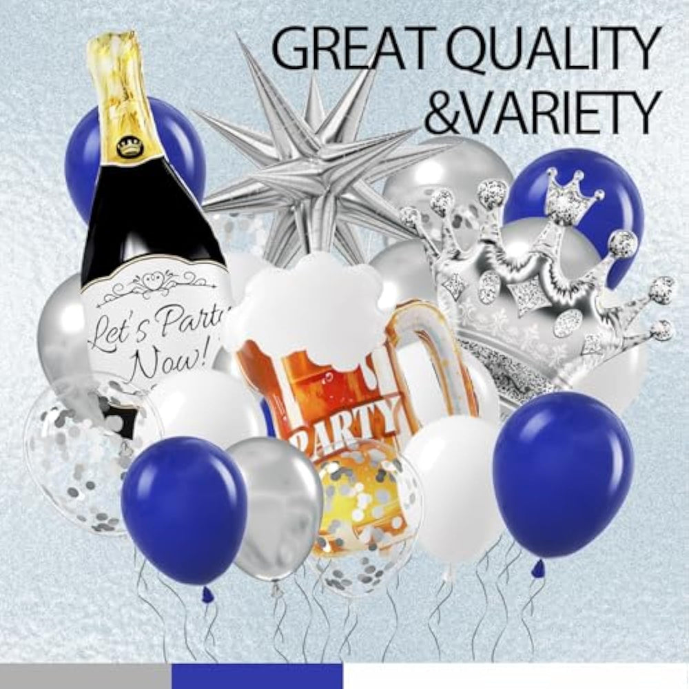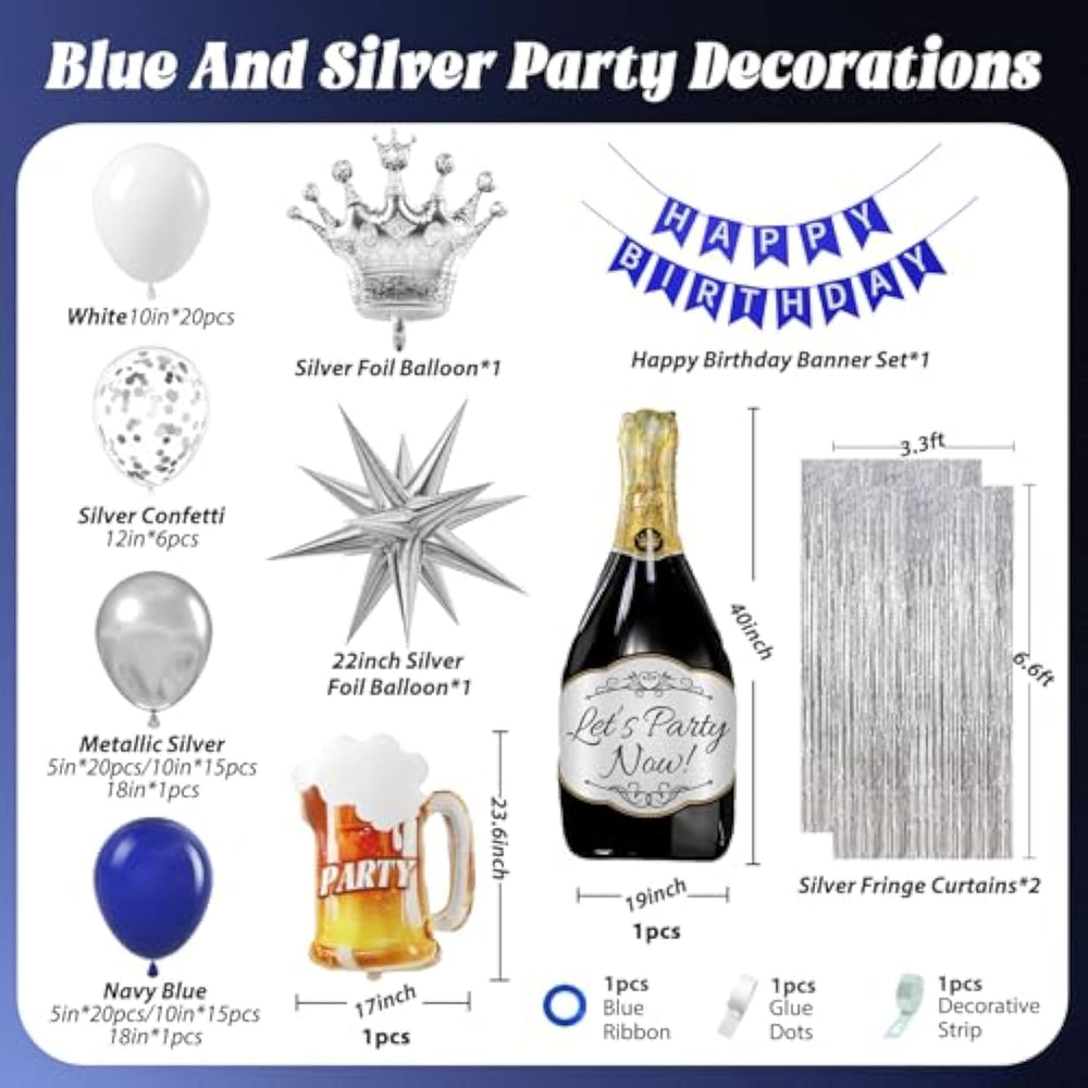 | Package Include: The Blue Happy Birthday Decorations Kit Included 36Pcs Navy Blue Balloons(18Inchx1, 10Inchx15, 5Inchx20), 36Pcs Metallic Silver Balloons(18Inchx1, 10Inchx15, 5Inchx20), 10Inch White Balloonsx20, 12Inch Silver Confetti Balloonsx6, Foil Balloonsx4, Happy Birthday Bannerx1, Silver Fringe Curtainsx2, Glue Dotsx100, Decorative Stripx1, Blue Ribbonx1 | | Complete Party Set: This Men Birthday Decorations Set Includes Balloons, Happy Birthday Banner, 2 Fringe Curtains, And Foil Balloons. The Blue And Silver Balloons With Male Themed Foil Balloons Creates A Mature Atmosphere, Faultless For Your Celebration | | Great Quality: Our Blue And Silver Birthday Decorations For Men Are High Quality. The Blue, Silver, And White Latex Balloons Are Great Quality And Less Likely To Burst. We Include Three Tools For Easy Balloon Garland Arch Creation: Ribbon, Glue Dots, Decorating Strip. For Foil Balloons, Use A Hand Pump To Inflate Through The Opening, And Deflate With A Straw For Reuse | | Widely Occasions: The Blue And Silver Party Decorations Are Widely Used For Different Occasions Party, That Include Blue Birthday Decorations For Men, And Can Be Used As 16Th, 18Th, 21St, 25Th, 30Th, 40Th, 50Th, 60Th, 70Th Birthday Party Decorations, Of Course You Can Also Choose It To Make Your Party More Faultless If You Want A Blue And Silver Theme Party | | Warm Reminder: We Are Dedicated To Great Service, If You Have Any Issues, We Will Work Hard To Solve Them Until You Are Satisfied | |