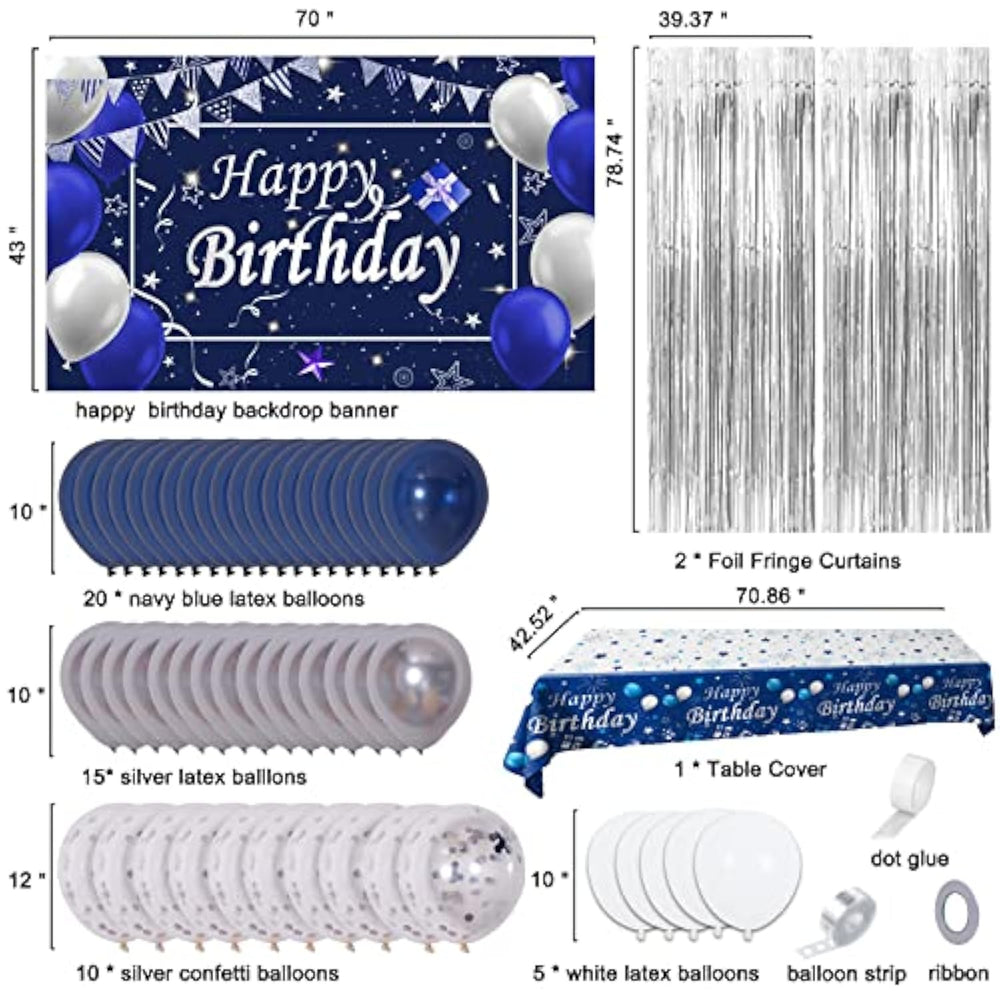 This blue and silver birthday decoration kit includes everything you need to create a stylish and festive celebration. It comes with a large "Happy Birthday" backdrop (59"x39"), a matching table cover (70"x42"), 60 balloons in blue, silver, white, and silver confetti, a foil fringe curtain, 10m of ribbon, and a straw. Designed for men and women of any age, this elegant blue-silver theme suits birthdays from 1st to 60th and beyond. Made with high-quality, eco-friendly materials, the kit is safe, durable, and easy to set up—perfect for indoor or outdoor parties.