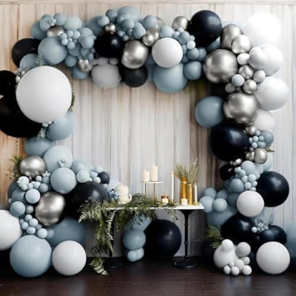 Make your celebration unforgettable with this Double-Stuffed Blue, Black & Silver Balloon Garland Kit, featuring a stunning mix of dusty blue, pearl white, metallic silver, and matte black balloons in 5", 12", and 18" sizes. Crafted from high-quality, durable natural latex, these balloons are safe, long-lasting, and suitable for both air and helium. Easy to assemble with a balloon pump, the kit lets you create a professional-looking arch in no time—perfect for birthdays, weddings, graduations, baby showers, Halloween, and more. For a fuller look, 2–3 kits are recommended.