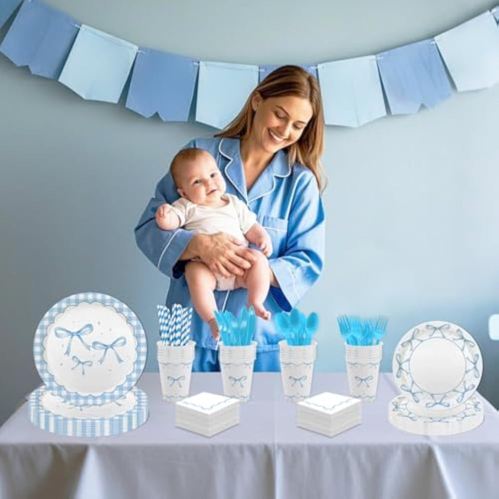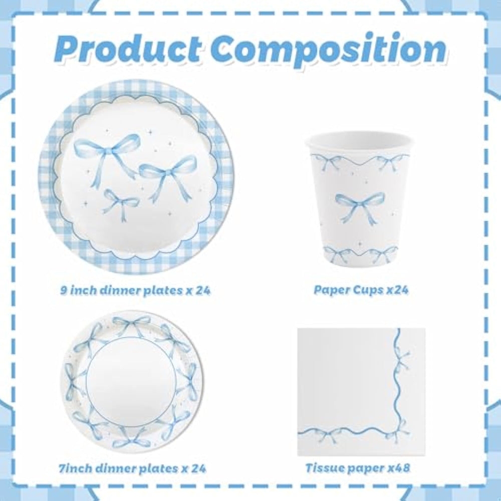 | Blue Bow Party Plates Supplies Set: Our Blue Bow Party Plates Supplies Set Severs For 24 Guests, Including 24 Pcs 7'' Dessert Plates, 24 Pcs 9'' Dinner Paper Plates, 24 Pcs Paper Cups, 48 Pcs Paper Napkins. Helping You Host Bridal Engagement Birthday Party With Ease | | High-Quality Material: Our Blue Bow Plates,Cups And Napkins Are Made Of Quality Paper, Safe, Lightweight And Easy To Grip | | Exquisite Design: Our Blue Bow Party Plates Supplies Set Has Adopted Consistent Patterns And Colors, Which Are Predominantly Blue. Patterned With Blue Bow. These Blue Bow Party Plates Supplies Work Together In Perfect Harmony, Let People Feel The Happy Atmosphere Of Bridal Engagement Birthday Party And The Joy Of Anticipatioe | | Wide Applications: Our Blue Bow Party Plates Supplies Set Are Suitable For Bridal Engagement Birthday Party, Baby Shower, Newborn Birthday Party For Baby Girls, Also Can Be Applied Indoor Or Outdoor Dinner. Leave A Lasting Impression In The Memories Of Your Guests | | Easy To Clean: Our Blue Bow Party Plates Supplies Set Is Disposable, Environmentally Friendly, And Easy To Handle. You Can Just Throw Them In The Bin After The Party, Giving You More Time To Enjoy Party Time With Friends And Family And Less Time To Clean Up | |