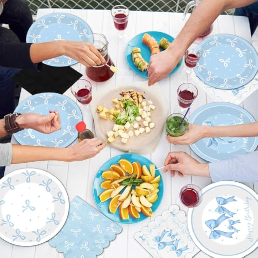 | Coquette Birthday Decorations - Decorate Your Party With This Exquisite Bow Tableware! The Package Includes 26Pcs Dinner Plates -9Inch, 26Pcs Dessert Plates -7Inch, 25Pcs Napkins -6.5X6.5Inch, 25 Pairs Of Knives And Forks, 25Pcs Cups (90Oz), And Bow Birthday Decorations To Make Your Party More Unforgettable And Enjoyable! | | High Quality - Our Bow Party Tableware Is Made Of High-Quality Materials, With Exquisite Pattern Printing, Rich Colors, And Is Not Easy To Fade Or Damage. The Napkins Are Soft, Comfortable, And Have Strong Water Absorption, Which Can Bring You A Themed Atmosphere Party! | | Blue Bow Theme Design - Our Blue Bow Party Bag Features Eye-Catching Bow Elements, Bright Colors, Exquisite Cuteness, And A Sweet Bow Design That Can Add A Touch Of Romance And Elegance To Your Party. | | Save Time And Enjoy The Party - After The Party, Simply Throw Them Away, Which Will Make The Cleaning After The Party Quick And Easy, And You Can Spend More Time Enjoying The Fun Of The Party With Your Family And Friends. | | Occasions - Our Bow Themed Tableware Is Suitable For Bow Birthday Decorations, Bride Engagements, Baby Showers, Garden Themed Parties, Picnics, And More, Adding A Dreamy Fairy Tale Atmosphere To Your Party. | |