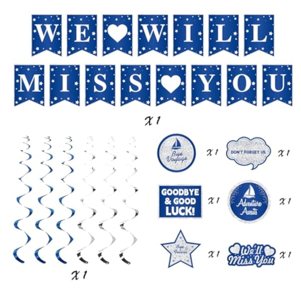 | We Will Miss You Decorations Includes - 6 X We Will Miss You Hanging Swirls, 1X We Will Miss You Banner. | | Suitable Scenarios: Retirement Parties, Farewell Parties, Rsignation Parties, Graduation Parties, Etc. You Can Post It Anywhere, Such As In The Office, The Room, Or On The Outdoor Wall. | | Easy To Operate: Our Farewell Party Banner Is Pre-Strung. Just Pull The Rope To Complete The Decoration. The Operation Of Hanging Swirls Is Also Very Simple. | | Unique Design And Better Quality: We Used Personalized Blue And Incorporated Star Elements, Making The Entire Banner Look More Distinctive. In Terms Of Raw Materials, We Adopted Thicker Cardboard To Ensure It Is Less Prone To Damage. | | Better After-Sales Service If You Encounter Any Questions Or Have Any Concerns About The Products You Have Received, Please Do Not Hesitate To