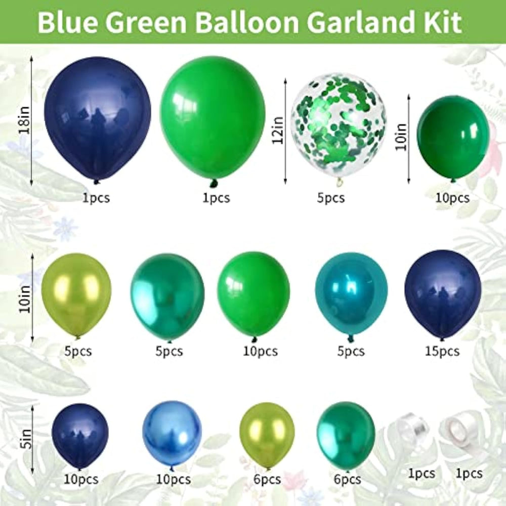 Create an unforgettable celebration with this Blue & Green Balloon Garland Arch Kit, featuring 89 high-quality latex balloons in a stunning mix of navy blue, chrome blue, metallic greens, and confetti styles. The kit includes everything you need—balloon strip tape, glue dots, and a variety of balloon sizes—for easy DIY setup. Perfect for birthdays, weddings, anniversaries, and festive occasions, these durable balloons can be filled with air or helium and arranged as garlands, banners, or centerpieces to elevate your party décor.