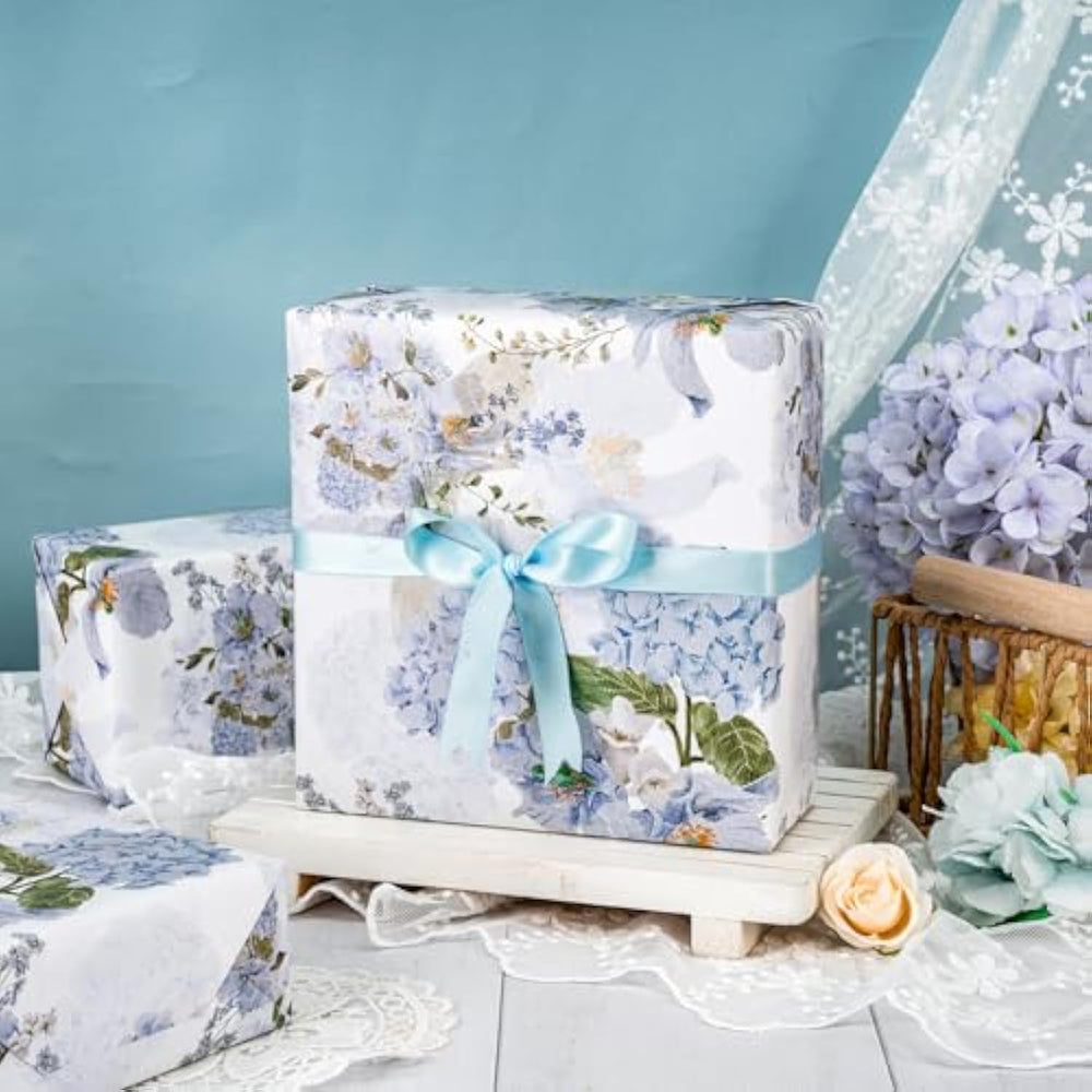 This floral wrapping paper showcases a delicate pattern of blue hydrangea flowers against a clean, elegant background, offering a timeless and nature-inspired aesthetic. The 17-inch wide by 16.4-foot long mini roll provides 23.2 square feet of coverage, making it ideal for wrapping several small to medium-sized gifts. Made from high-grade coated paper, it is thick, durable, and tear-resistant, ensuring your gifts are beautifully wrapped. Each roll comes carefully wrapped in shrink film to protect it from scratches and dust, ensuring it arrives in perfect condition.