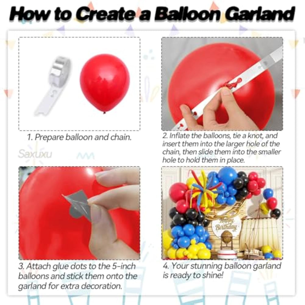 | Blue Red Yellow Balloons Arch Kit: The Set Includes 27 X Red Balloons (18Inch*1, 10Inch*18, 5Inch*8), 27 X Black Balloons (18Inch*1, 10Inch*18, 5Inch*8), 27 X Yellow Balloons (18Inch*1, 10Inch*18, 5Inch*8), 27 X Blue Balloons (18Inch*1, 10Inch*18, 5Inch*8), 16 X Long Balloons (Red*4, Blue*4, Yellow*4, Gold*4), 1 X White Ribbons, 2 X Dispensing Dots, And 1 X 5M Balloon Chain. | | Easy To Install: This Red Yellow Black Balloons Arch Includes White Ribbon, Balloon Chain, And Dispensing Dots. Whether You'Re Creating A Breathtaking Balloon Arch Or A Stunning Garland, This Kit Provides Everything You Need For An Easy. Suitable For A Birthday, Engagement, Bridal Shower, Bachelorette, Or Anniversary, Ensures That Your Decorations Remain Stylish And Elegant. | | High-Quality: Our Blue Red Black Balloons Arch Is High-Quality Balloons That Are Designed To Maintain Their Perfect Shape Once Inflated, Ensuring A Lower Chance Of Bursting When Inflated. Suitable For Any Event, From Birthdays To Weddings, It S A Hassle-Free And Safe Experience. Whether For Party Decorations Or Photo Backdrops, They Add The Perfect Touch To Any Occasion. | | Versatile For Any Occasion: This Blue Red Yellow Black Balloon Garland Is Suitable For Diy Decorators And Event Planners Alike. It Allows You To Effortlessly Attach Balloons And Create A Stunning Balloon Garland Or Arch In Minutes. Whether You’Re Hosting A Wedding, Baby Shower, Bridal Shower, Or Milestone Birthday, This Kit Helps You Achieve A Professional Party Setup With Minimal Effort. | | Diversified Scenarios: Blue Red Yellow Black Balloon Arch Brings A Sophisticated Touch To Your Party Decorations. Whether Used Indoors Or Outdoors, This Balloon Garland Kit Adds A Luxurious, Celebratory Feel To Birthday Parties, Weddings, And Any Event. We Are Committed To Providing High-Quality Wedding Supplies, Birthday Decor, And Party Essentials To Make Your Celebrations Unforgettable. | |