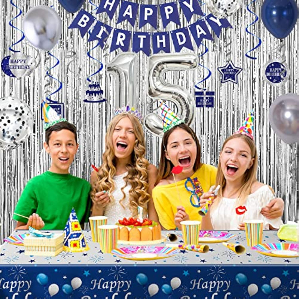 Celebrate a memorable 15th birthday with this complete navy blue and silver decoration set—perfect for boys, girls, or anyone turning 15! This all-in-one party pack includes a "Happy Birthday" banner, tablecloth, silver fringe curtains for a photo backdrop, hanging swirls, and a mix of 37 balloons, including a large silver "15" foil balloon. Designed for easy setup indoors or outdoors, you can create balloon arches, decorate tables, and set up a fun photo area in minutes. Made from durable, reusable materials, these stylish decorations bring a festive, elegant touch to any 15th birthday celebration.