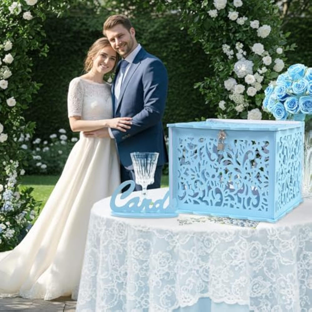 | Large Capacity: With A Spacious Size Of 12.2 X 8.85 X 8.66 Inches And A Generous 7.87-Inch Top Slot, This Wedding Box Can Easily Accommodate 200-300 Cards, Envelopes, Or Monetary Gifts. Ideal For Collecting Blessings At Weddings, Birthdays, Graduations, And Baby Showers. | | Personalized Butterfly Decorations Included: Each Set Includes 12 Three-Dimensional Butterfly Stickers In Various Sizes. You Can Freely Choose To Decorate The Wedding Money Box With Them Or Keep It Simple—Add A Personal Touch That Reflects Your Event’S Style And Theme. | | Elegant Blue Pvc Design: Crafted From Durable Pvc Material, This Elegant Card Box Wedding Adds A Pop Of Color To Your Event. Designed With A Locking Lid For Added Security, It’S Perfect For Safely Collecting Cards And Envelopes During Weddings, Parties, Or Showers. | | Quick Assembly: Assembling This Card Box With Lock Takes Just Minutes. The Pvc Panel Is Removable. After Your Event, Retrieving Cards And Gifts Is Effortless—No Hassle Or Damage, Just A Smooth Experience From Setup To Storage. Perfect For Busy Event Days When Every Second Counts. | | Reusable For Everyday: Not Just For Weddings—This Cards Box Is Perfect For Baby Showers, And Fund Collections. After The Event, Use It As A Memory Box, Decorative Storage, Or Part Of Your Home Décor. A Keepsake You’Ll Enjoy Well Beyond The Celebration. | |