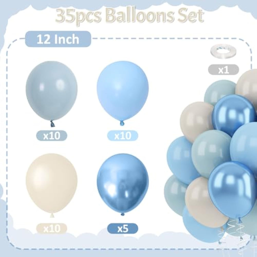 | Package Contents: Blue And White Balloons Set Includes, 10 12Inch Fog Blue Balloons, 10 12Inch Pastel Blue Balloons, 10 12Inch Beige Balloons, 5 12Inch Chrome Blue Balloons, 1 Roll Of 10 Meters Ribbon Balloon Accessory For Your Decoration Needs | | Various Occasions: Dusty Blue Beige Balloons Pack, Great For Themed Events Such As: Birthday Parties, Baby Showers, Bridal Shower, Gender Reveal, Wedding Ceremony | | High-Quality Balloons: Blue White Latex Balloons, Made Of High-Quality Natural Latex, Ensuring Safety And Durability; Please Note That Latex Balloons May Exhibit Slight Color Variations When Uninflated, Becoming More Vibrant And Full-Bodied Once Inflated; Additionally, Color Variations May Occur Due To Different Monitor Settings And Lighting Conditions, Which Is Normal | | Easy To Inflate: Dusty Blue Balloons Are Easy To Inflate Using Either A Manual Or Electric Pump, Which Can Also Be Filled With Helium For Floating Purposes; Avoid Over-Inflating To Prevent Bursting, Around 85% Is Optimal; After Inflation, Tie The Knot Tightly To Prevent Accidental Damage | | Tips: For The Safety Of Children, Adult Supervision Is Recommended When Handling Balloons; It Is Best To Make Balloon Decorations A Few Hours Before The Event Or Party To Keep The Balloons In Their Best Condition | |