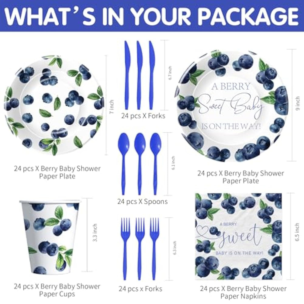 | ?Sweet Blueberry Decorations Tableware?Add A Fresh And Fruity Touch To Your Celebration With This Charming Blueberry-Themed Tableware Set, Perfect For 1St Birthdays, Baby Showers, Or Any Berry Sweet Gathering | | ?What Will You Get?Our Blueberry Party Supplies For Baby Shower Set Includes 24Pcs 9'' Blueberry Dinner Plates, 24Pcs 7'' Berry Sweet Baby Shower Dessert Plates, 24Pcs Paper Napkins, 24Pcs Party Cups, 24 Sets Of Cutlery | | ?Applicable Occasions?Whether You'Re Hosting A Garden Party, Summer Parties, Picnic, Baby Shower, First Birthday, Or Fruit-Themed Bash, These Blueberry Birthday Party Decorations Add A Fresh And Festive Flair To Any Setting | | ?Save Time?Hosting A Party Is Now Effortless With The Disposable Blueberry Baby Shower Table Decorations Dinnerware Set. Once The Celebration Ends, Simply Toss Everything Away For A Quick And Easy Cleanup—No Hassle, No Mess | | ?Quality Material?Crafted From Materials, This Set Ensures A Safe And Reliable Dining Experience. Enjoy Your Event With Ease, Knowing Your Tableware Is Both Practical And Elegant | |