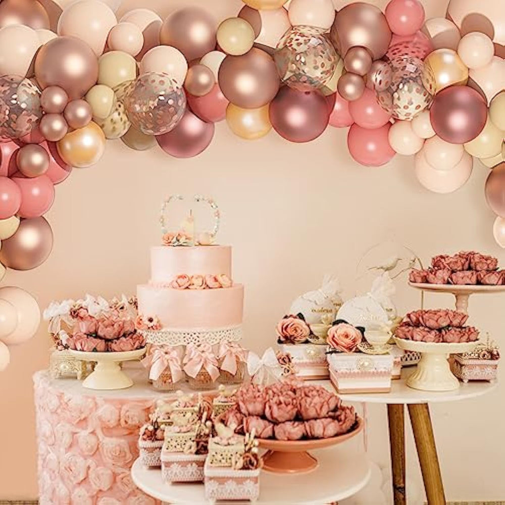Create a stunning and elegant setup with this 170-piece Blush Pink Balloon Garland Kit. It includes 3 large 18" balloons, 18 metallic and confetti 12" balloons, 145 mixed 10" and 5" balloons in dusty pink, pastel orange, peach, champagne, and ivory, plus 4 essential accessories for easy assembly. Designed in chic boho tones with rose gold and chrome accents, this kit is perfect for birthdays, baby showers, bridal showers, weddings, engagements, and more. Made from premium, non-toxic latex, the balloons are safe, durable, and simple to inflate and arrange into a beautiful arch with minimal effort.
