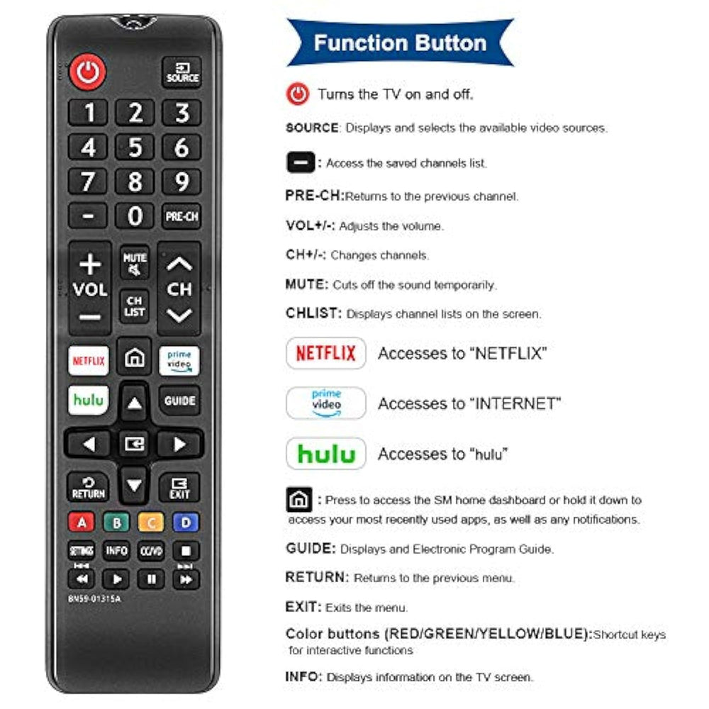 Bn59-01315A Bn59-01315J Replacement For Samsung Smart Curved Tv, 4K Uhd Curve Ultra Hdtv Led 6 7 8 Series Tv, With Netflix/ Prime Video / Hulu App Keys. | | Control Remote For Samsung Smart Tv. Works Right Out Of Box Without Any Programming. Just Insert 2 Aaa Batteries(Not Included) To Work. | | Please Find Your Samsung Tv Remote Models Below, In The Product Description. | | Compatible With Samsung 4K Smart Tv: Ue49Ru7300Un32N5300 Un40Nu7100 Un43Nu6900 Un43Nu7100 Un43Ru7100 Un43Ru710D Un43Ru7200 Un50Nu6900 Un50Nu710 | | Un55Nu7100Un55Nu7300 Un55Ru7100 Un55Ru710D Un55Ru7200 Un55Ru7300 Un55Ru730D Un58Nu7100 Un58Ru7100 Un58Ru710D Un58Ru7200 Un65Nu6900 Un65Ru7100 Un65Ru710D Un65Ru7200 Un65Ru7300 Un65Ru730D Un75Nu6900 Un75Nu7100 Un75Ru7100 Un75Ru710D Un75Ru7200 And More. |