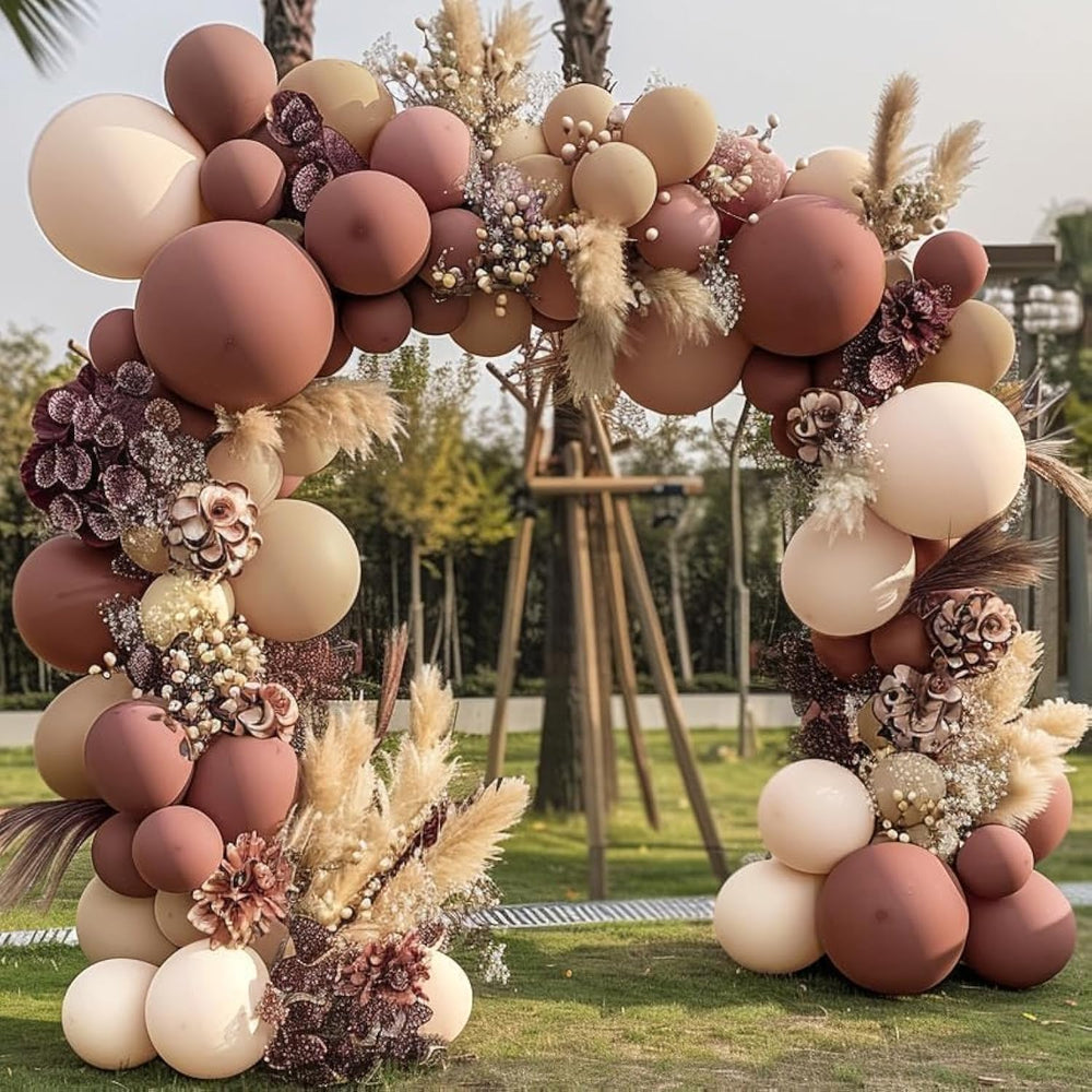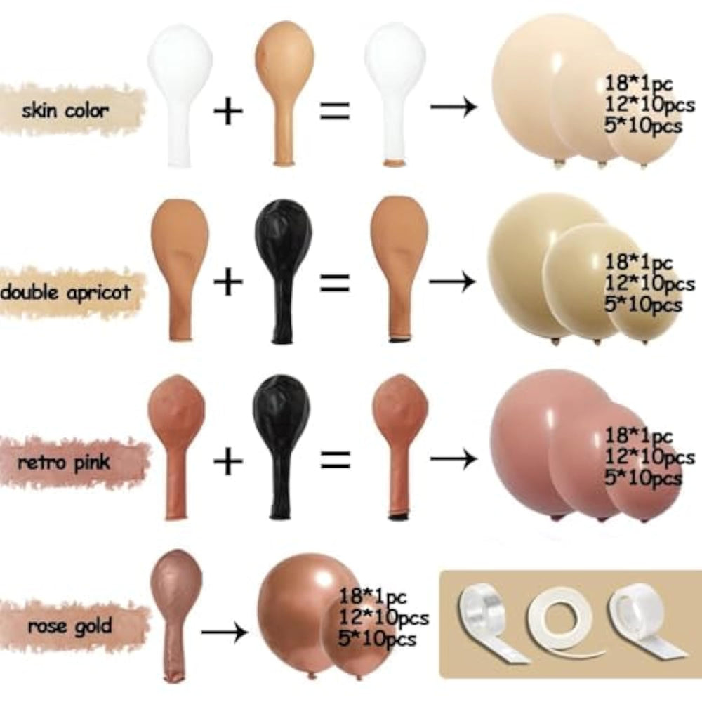 This Double Dusty Rose Balloon Set includes double-layer dusty pink balloons (5"x10, 12"x15, 18"x2), double-stuffed blush cream balloons (5"x10, 12"x15, 18"x2), double-layer nude balloons (5"x10, 12"x15, 18"x2), and champagne gold balloons (5"x15, 12"x10), along with a 16ft balloon strip tape, 100pcs glue dots, and a 33ft pink curling ribbon. For a large balloon arch display, 2β3 packs are recommended. Easy to assemble with included balloon accessories, this boho balloon garland kit lets you quickly create a stunning beige, rose, and champagne pink gold balloon arch, making setup fun and effortless for the whole family. Made from premium natural latex, these balloons are safe, non-toxic, durable, and long-lasting for up to 72 hours when properly inflated. The different sizes and colors combine beautifully, allowing you to DIY a charming dusty rose and cream balloon arch for weddings, baby showers, birthdays, bridal showers, or any celebration.