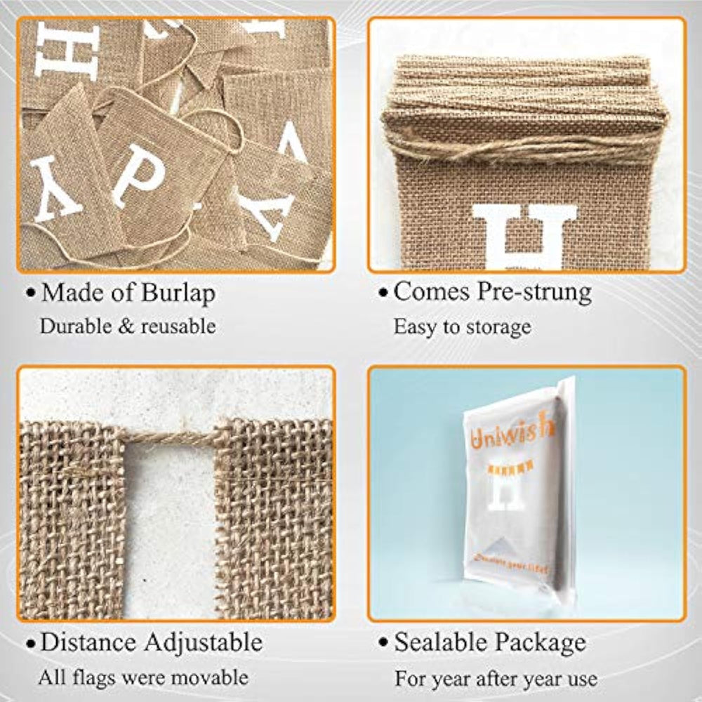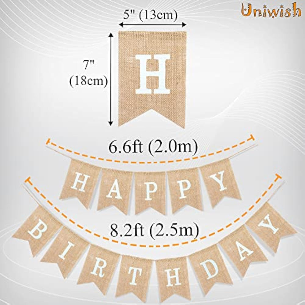 This neutral burlap "Happy Birthday" banner is made from 100% natural burlap, offering a rustic, boho charm that's both durable and reusable. Pre-strung for convenience, each 5" x 7" flag is printed with bold letters and comes with a 6.6 to 8.2-foot string, making it easy to hang and store. Its simple yet classic design complements any birthday theme—whether it’s a child’s first birthday or an 80th celebration. Perfect for indoor or outdoor use, it works beautifully over dessert tables, on walls, between trees, or as a photo backdrop.