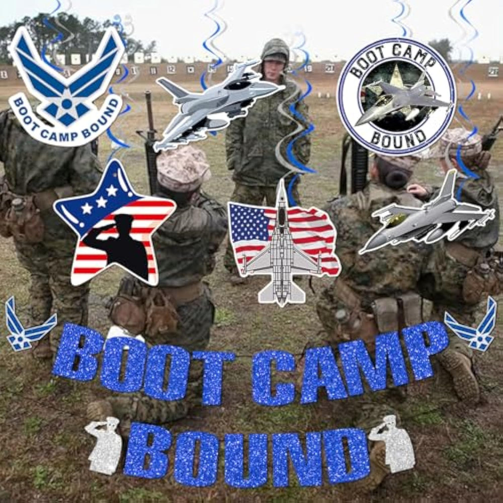 | Easy To Use, Ready To Hang: This Complete Army Party Decorations Kit Includes One “Boot Camp Bound” Banner And Six Spiral Hangings With Pre-Punched Holes And Strings For Quick Setup. Save Time While Making A Big Impression With A Display That’S Both Eye-Catching And Meaningful | | Premium Quality Army Decorations For Party: Crafted From Durable, High-Quality Cardstock With Vibrant Blue Glitter Lettering, This Banner Is Built To Last Through Your Celebration. Each Swirl Decoration Features Unique Military Aircraft And Patriotic Elements—Ideal Army Decorations For Party Lovers And Military Families Alike | | Unique Military Decor That Stands Out: Unlike Generic Army Decor, This Boot Camp Decoration Set Combines Classic Military Icons With Dynamic Aviation Graphics And Red, White, And Blue Motifs. It Brings Energy And A Heartfelt Tribute To Your Celebration—Perfect For Decorating Homes, Party Halls, Or Even Dorm Send-Offs | | Celebrate The Journey To Boot Camp: Get Ready To Honor Your Future Soldier With Our “Boot Camp Bound” Banner And 6 Hanging Swirl Cards—Perfect For Any Military-Themed Celebration. Whether You'Re Planning Army Birthday Party Decorations Or An Enlistment Send-Off, This Set Adds A Bold Patriotic Flair That Captures The Pride And Spirit Of Service | | Perfect For Boot Camp Send-Offs And More: Whether It’S For A Military Going-Away Party, Army-Themed Birthday, Or Patriotic Event, Our Military Decor Set Helps You Celebrate With Pride. Each Pack Includes 1 “Boot Camp Bound” Banner And 6 Spiral Cards—Bringing A Touch Of Honor To Any Army Decorations Theme | |