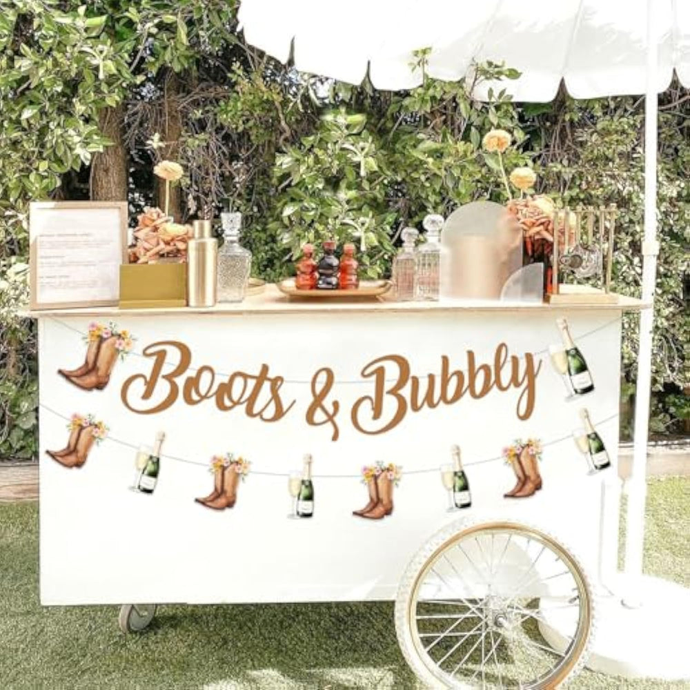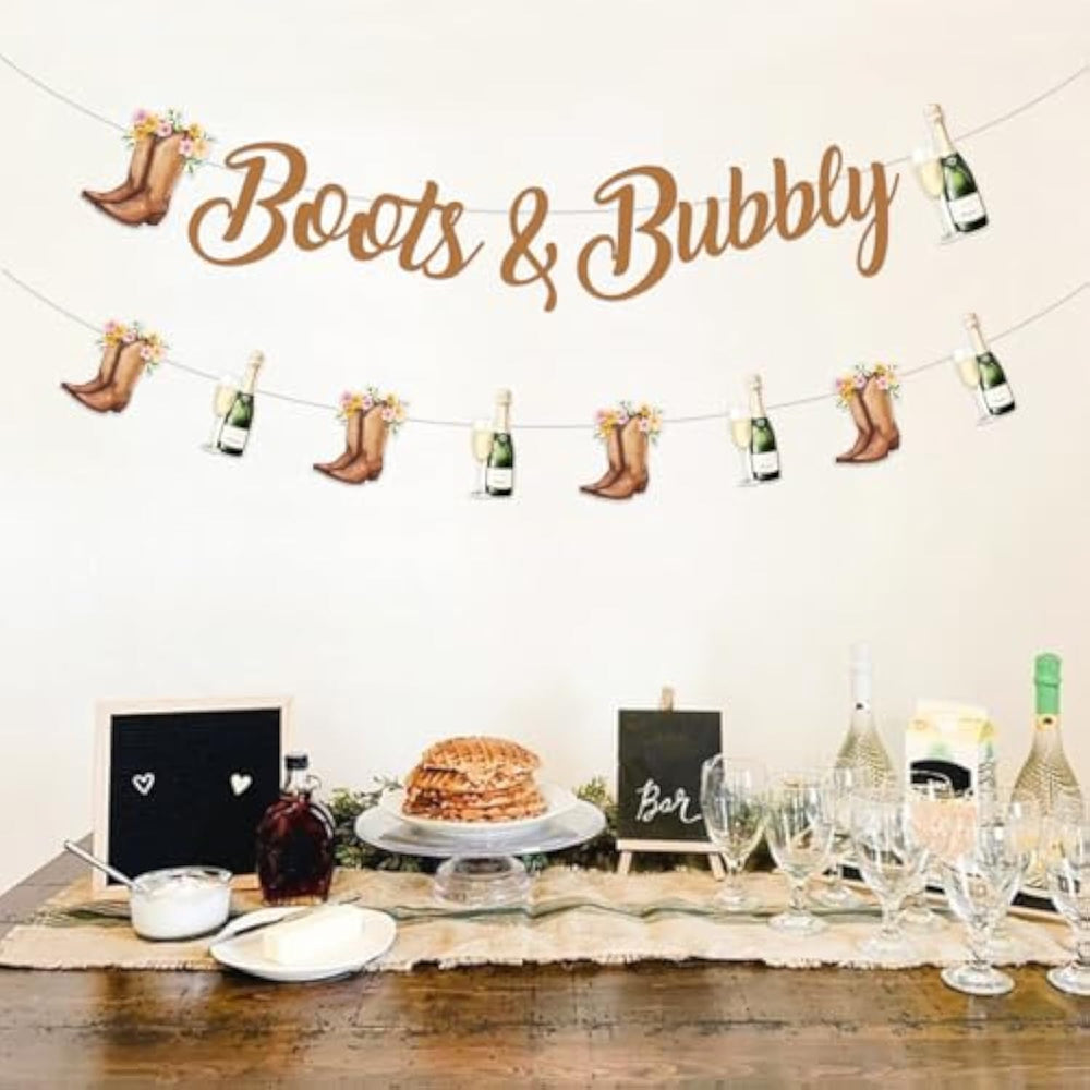 | Package Includes: You Will Have 1 Boots And Bubbly Bridal Shower Banner With 9 Pieces Of Cardstocks, 1 Boots And Champagne Bachelorette Party Banner With 8 Pieces Of Cardstocks. You Can Use Them To Decorate The Party And The Party Will Be Filled With Exquisite Atmosphere. | | Diy: The Boots And Bubbly Bridal Shower Banner With 9 Pieces Of Cardstocks Has Been Pre-Punched, You Just String These Cardstocks Together With A Ribbon, And You Can Adjust The Distance Between The Cards By Yourself And Hang Them Anywhere You Want To Supply Such As Door, Wall, Curtain, Table, Ceiling. | | Quality Material: These Brown Western Cowgirl Wedding Decorations Banners Are Made Of Paper, Sturdy, Lightweight And Easy To Handle. | | Boots And Bubbly Theme Design: For The Boots And Bubbly Bridal Shower Bachelorette Party Banner, The Letter Bootsbubbly Is Printed On It. And The Brown Western Cowgirl Bachelorette Party Banner Has 2 Different Patterns Boots And Champagne, Making Your Boots And Bubbly Themed Party More Joyful And Interesting. | | Wide Application: These Western Cowgirl Bachelorette Party Decorations Are Ideal For Female Boots And Bubbly Bridal Shower, Boots And Champagne Bachelorette Party, Western Cowgirl Wedding And Engagement, Which Will Make Your Party Funny And Unforgettable. | |