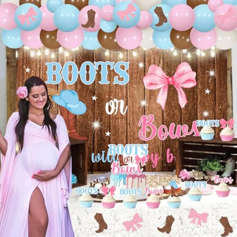 | Package Includes: The Boots Or Bows Gender Reveal Decorations Include 50 X Latex Balloons 12 Inches, 10 X Latex Balloons 5 Inches, 1 X Boots Or Bows Backdrop 3 X 5 Ft, 1Pcs Boots Or Bows Cake Topper, 12Pcs Boots Or Bows Cupcake Toppers, 6Pcs Boots Or Bows Stickers | | Boots Or Bows Gender Reveal Decorations: Share Your Happiness With Your Families And Friends In The Most Adorable Way With A Boots Or Bows Gender Reveal Party! These Western Cowboy Cowgirl Gender Reveal Decorations Are The Perfect Choice For Your Party, And They Add More Fun To Your Boy Or Girl, He Or She And What Will Baby Be Gender Reveal Party | | Boots Or Bows Backdrop: This Boots Or Bows Backdrop Backdrop Is Printed Clear, Vibrant And High Resolution. The Size Of This Backdrop Is 3 X 5 Ft, And It Is Made Of Lightweight, And Durable Vinyl Material. This Boots Or Bows What Will Baby Be Backdrop Is Perfectly Combining Western Cowboy Cowgirl Style. Pink Bows And Blue Hats Were Printed On Our Backdrop, Which Is Perfect For Boots Or Bows Gender Reveal Party | | Pink And Blue Balloons Arch Kit: We Offer Balloons In White, Pink, Blue And Light Brown To Make Balloon Arch. Besides, We Offer Boots Or Bows Stickers Which Can Be Attached To Balloons. In Addition, We Also Provide Balloon Garland Strip And Adhesive Dots Tool To Help You Complete The Balloon Chain. It Will Save Time And Let You Enjoy The Fun Of Diy | | Exquisite Cake Cupcake Toppers: The Boots Or Bows Cupcake Cake Toppers Are Made Of High Quality Card Stock And Double-Sided, They Are Sturdy And So Cute For Your Cowboy Cowgirl Gender Reveal Party Decorations. Using Conveniently, You Just Open The Package And Insert The Cake To Complete The Final Decoration For The Party. They Will Make The Cake Extra Unique, Add A Touch Of Glamour And Looks Wonderful In Pictures | |
