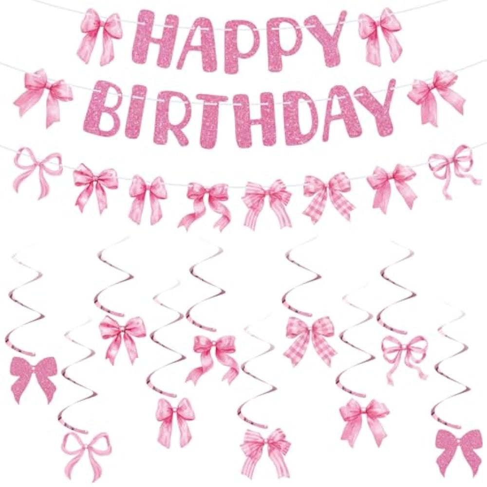 | Bow Party Decorations: Our Bow Party Decoration Set Is Designed To Create A Relaxed Atmosphere, Enhance The Sense Of Ceremony Of The Party, And Leave Pleasant Memories For Participants. The Bow Design Highlight The Sweet Temperament, So That Every Guest Can Feel The Joyful Atmosphere Of The Party. | | Exquisite Set: Our Set Contains 45 Pcs, 3 Bow-Themed Party Banners And 10 Hanging Card Accessories. The Banners Are Embellished With Exquisite Bow Patterns, Adding Liveliness And Sweetness To Your Party | | Material: The Banner Is Made Of Durable Thick Cardboard, Which Is Not Only Beautiful, But Also Sturdy And Reliable. These Decorations Can Be Reused On Different Occasions, Helping You Create A Perfect Party Experience Many Times | | Easy To Use: Our Pink Bow Birthday Decorations Adopt A Semi-Pre-Assembled Design, The Banner Is Already Fully Assembled, You Only Need To Hang It To Easily Complete The Party Layout. And The 10 Bows Hanging Swirls Are Designed For Easy Assembly Mode, We Come With A Video Tutorial To Help You Quickly Complete The Decoration Arrangement. | | Wide Application: Our Banner Is Perfect For Birthdays For Girls Of Different Ages And Can Add A Special Touch To Your Event. | |