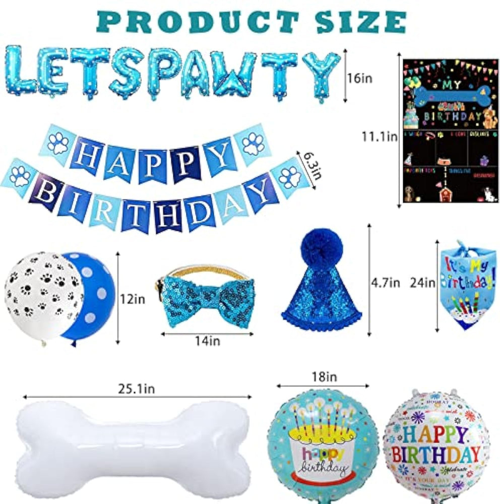 This all-in-one Dog Birthday Party Decorations Set includes everything you need to throw a fun "Let's Pawty" celebration for your pup: a birthday banner, party hat, scarf, cake topper, number set (0–9), birthday poster, bowtie, and a variety of balloons—paw prints, blue dots, “Let’s Pawty” foil, bone-shaped, and two 18" balloons. Made with soft, lightweight materials, the bandana, bowtie, and hat are comfy and adjustable to fit most dogs. Celebrate your furry friend’s special day in style and create lasting memories with this complete and customizable party kit.
