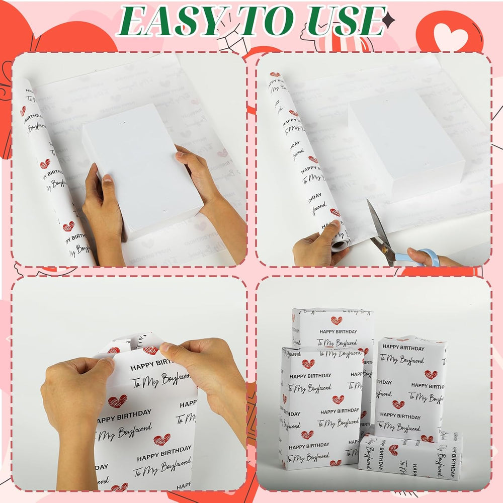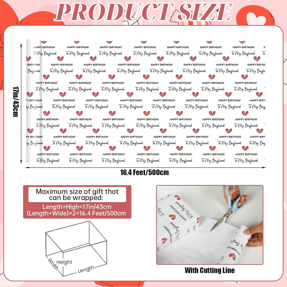 | You Will Receive: A Roll Of Boyfriend Birthday Wrapping Paper. This Boyfriend Gift Wrap, With Its Highly Modern And Minimalist Aesthetic, Can Bring Just The Right Amount Of Elegance To Your Special Occasion, Perfectly Showcasing Its Unique Taste Appropriate Size: Our Boyfriend Birthday Wrapping Paper Is 17 Inches X 16.4 Feet ( 43 Cm × 500 Cm ) In Size, Making It Perfect For Wrapping Any Small Or Medium-Sized Gifts And Also Very Convenient For Storage Quality Paper Material: This Him Valentine'S Day Gift Wrap Is Made Of Quality Coated Paper, Thick And Tear-Resistant, Safe For Wrapping Gifts. The Printed Colors Are Vibrant, The Pattern Is Clear, And It Will Not Fade Easily Charming Design: This Boyfriend Birthday Gift Wrap Features A White Background With The Text "Happy Birthday To My Boyfriend" Intertwined With Romantic Red Hearts, Overflowing With Sweet Love, As If Every Inch Is Whispering Words Of Love And Blessings Wide Uses: This Him Birthday Wrapping Paper Can Not Only Be Used For Wrapping Gifts For Boyfriends Or Husbands On Birthdays, Parties, Holidays, And Other Special Occasions But Also For Party Table Decorations, Backdrops, Diy Craft Projects, And Other Artistic Creation Inspiration