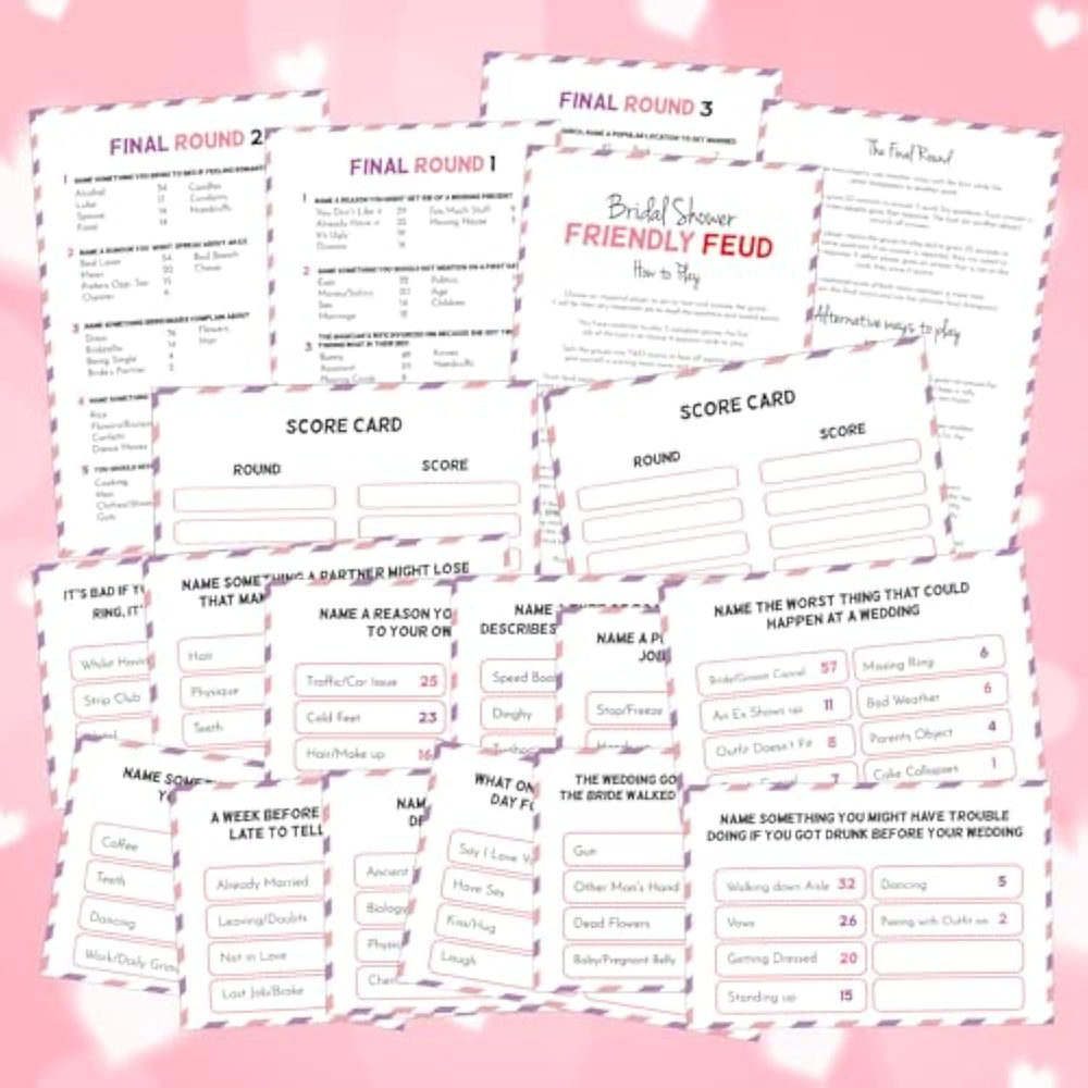 | Bridal Shower Friendly Feud Game Set: Enjoy A Lively Trivia Night With Our Complete Set, Includes 1 Game Instruction Card, 2 Score Cards, 12 Bridal Shower Them Question Cards And 3 Quick Final Game Cards, 18 Cards In Total For Non-Stop Fun | | Game Answer Buzzers: The Feud Game For Adults Comes With Buzzers For Open Rules To Ensure Smooth Game Play; The 2 Included Buzzers Powered By 2 Aaa Batteries (Not Included), Simply Press To Light Up And Sound Off, Which Help Keep The Game Organized And Thrilling, Making It Nice Addition To Your Family Feud Game Night | | Quality Material: Crafted From Quality Paper, Our Reusable Game Cards Feature Clear Printing That Won'T Fade; Each Beautifully Designed Wedding Party Trivia Game Card Adds A Joyful Touch To Your Special Day Celebrations, Ensuring Memorable Moments With Family And Friends | | Convenient Card Sizes: Our Bridal Shower Theme Question Cards Are Conveniently Sized At 4 X 6 Inches And 4.7 X 7 Inches For Easy Handling; Detailed Instructions Are Included To Make Gameplay Easy And Enjoyable For Everyone | | Party Supplies: The Holiday Feud Game Is Ideal For Bachelorette Parties, Bride And Bridesmaids Parties, Family Gatherings, Wedding, Which Will Bring You And Your Family Or Guests Unlimited Fun, Enhancing Your Party Atmosphere And Creating Lasting Memories | |