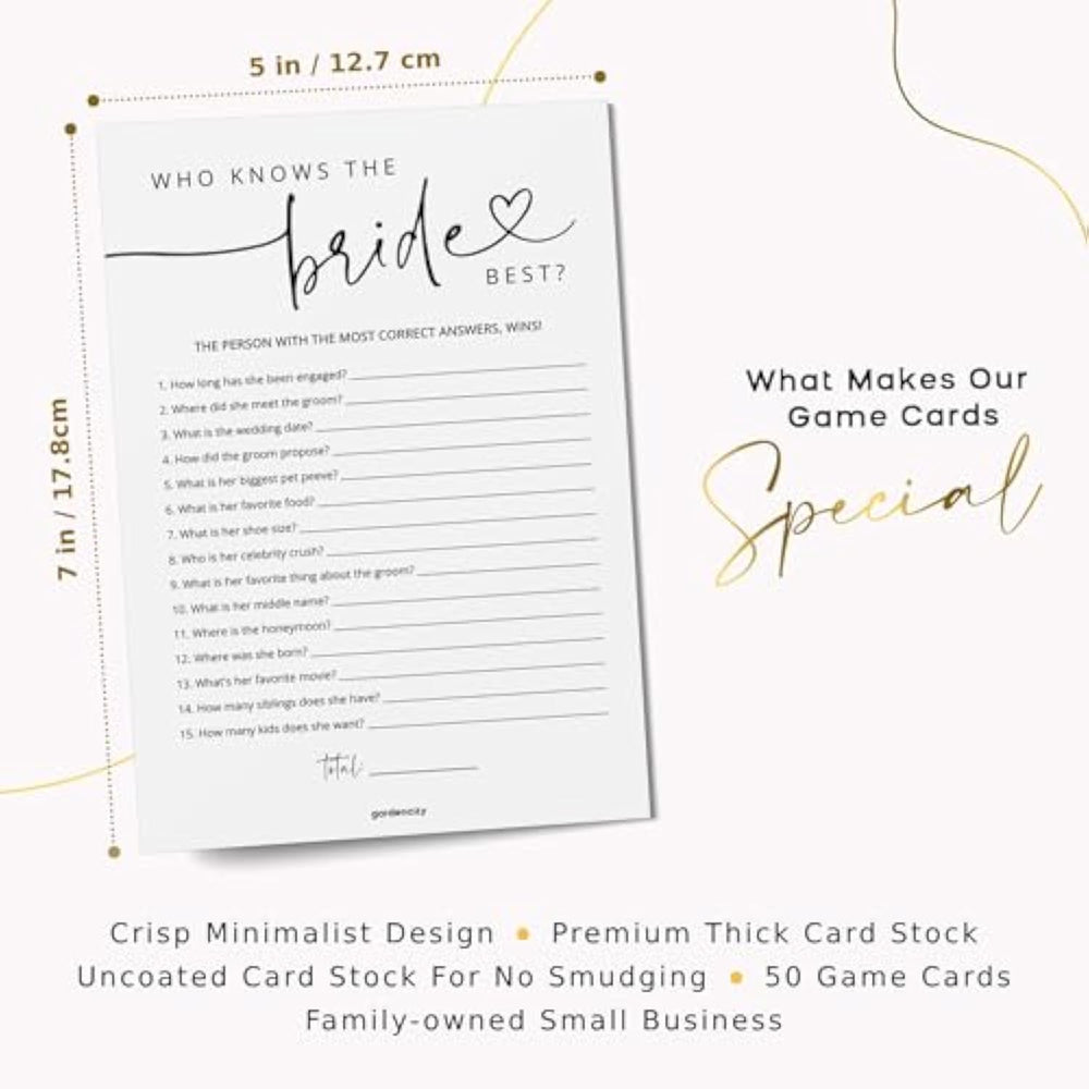| Engaging Entertainment: Includes 50 Beautiful Game Cards That Spark Laughter And Create Unforgettable Memories For Your Bridal Shower, Wedding, Or Bachelorette Party. | | Premium Quality: Feel The Difference With Our Cards Made From Extra-Thick Card Stock, Ensuring A Premium, Durable Finish That Match The Quality Of Your Event. | | Perfect Size: Each Card Measures A Perfect 5X7 Inches, Ideal For Easy Handling And Display. | | Instant Fun: Our “Who Knows The Bride Best” Game Cards Come With All You Need, Making It Simple To Bring Everyone Together For A Moment Of Joy And Bonding As Guests Test Their Knowledge And Uncover Who Truly Knows The Bride Best. | | Variation: Check Out Our Store For More Games And Ideas That Will Make Your Celebration One To Remember. | |