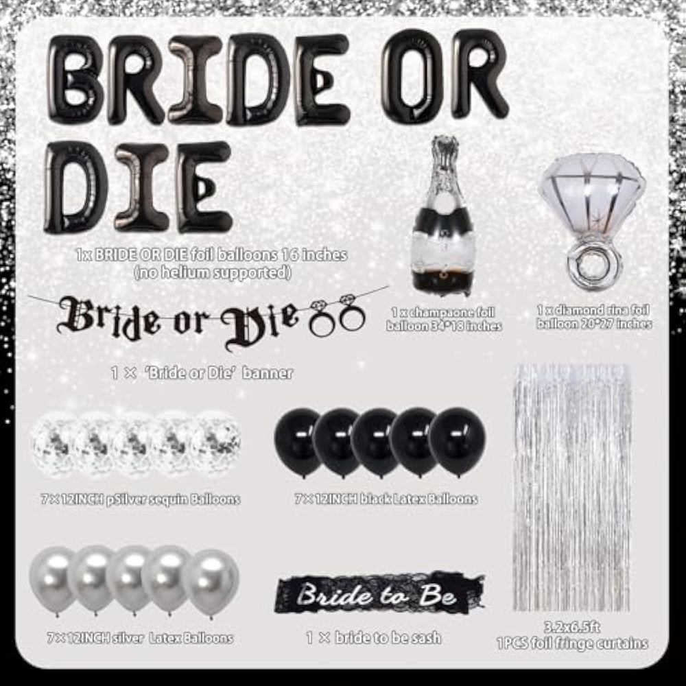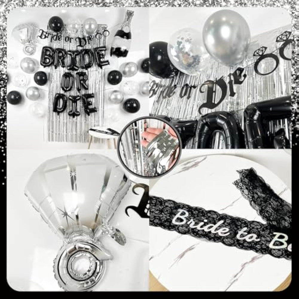 This all-in-one "Bride or Die" bachelorette party decoration set includes everything you need to throw a bold and stylish celebration. The kit features a set of 16-inch foil letter balloons spelling “Bride or Die,” a “Bride to Be” banner, a diamond ring foil balloon, a champagne bottle balloon, a lace sash, a foil fringe curtain, and a mix of black, silver, and confetti balloons. With its sleek black and silver color scheme and high-quality materials, this set adds a touch of edgy elegance to any bachelorette, bridal shower, engagement, or wedding event. Designed for convenience, it’s the perfect way to create a standout party with minimal effort.