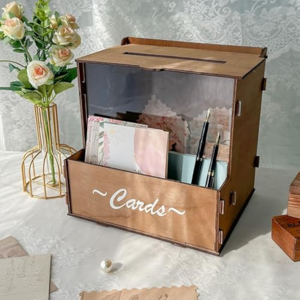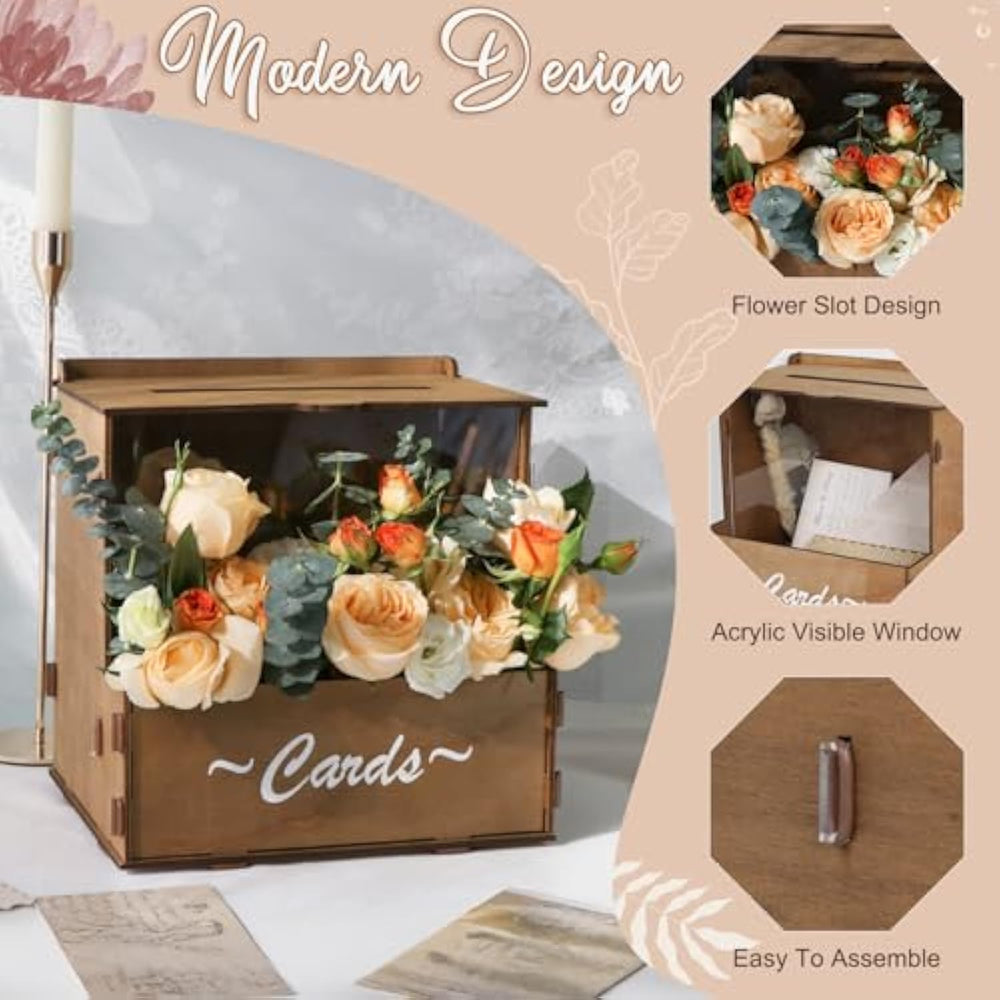 | Unique Design: This Brown Card Box For Wedding Features A Built-In 2-Inch-Wide Flower Trough On The Front, Allowing You To Decorate It With Your Favorite Flowers Or Greenery. Wooden Box Unique Design Adds A Warm, To Your Reception Or Event, Creating A Lovely Focal Point For Guests To Drop Their Cards. | | Large Capacity: Measuring 9.8×7.8×9.4 Inches, This Card Box For Party Holds 200–250 Standard Cards, Notes, Or Envelopes. The Wedding Gift Box 6.3-Inch Long Card Slot On Top, Making It Easy For Guests To Insert Cards Without Folding Or Damaging Them, Ensuring Smooth Use At Busy Events. | | Rugged Durable Material: The Gift Card Box Is Made Of Durable Poplar Composite Wood And Sturdy Acrylic To Effectively Resist Rolling And Collapsing And Ensure Long-Term Use Reliability. The Transparent Acrylic Front Panel Design Makes It Easy To Easy Viewing Of Contents In The Box. | | Easy Fast Assembly: This Card Box Wedding Adopts An Easy Assembly Design, Allowing You To Say Goodbye To The Complex Installation Process. Simply Use The Included High Elastic Brown Rubber Band, Without Any Extra Tools, And Complete The Entire Assembly Process In A Few Minutes For A Single Person. | | Multiple Occasions: Wedding Box For Cards And Money, Perfect For Weddings, Graduations, Baby Showers, Birthdays, Anniversaries, Baptisms, Or Prayer Events. This Wooden Gift Box Blends Into Any Decor. Its Natural Wood Grain And Floral Design Make It Suitable For Both Casual And Elegant Celebrations. | |