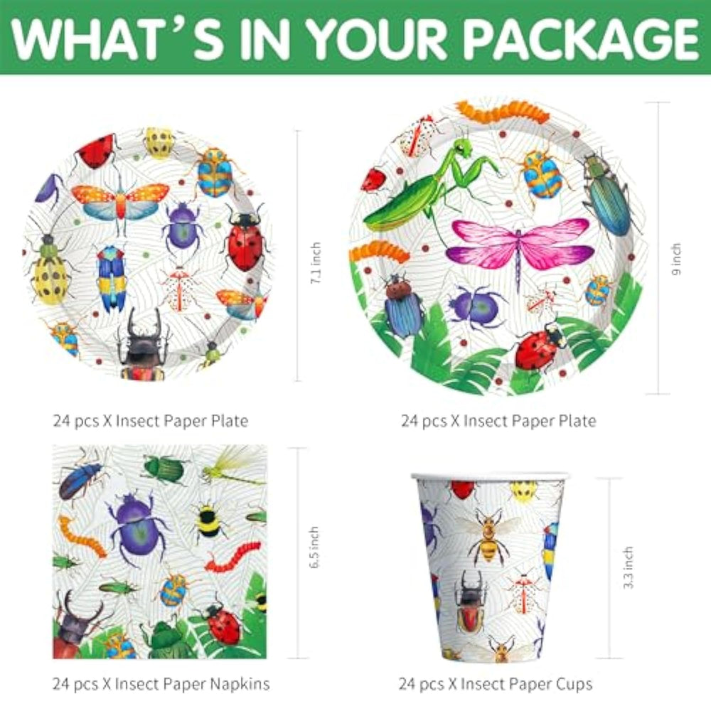 Planning a bug-themed celebration? This vibrant insect party tableware set is perfect for birthdays, baby showers, or any nature-inspired event. Featuring colorful illustrations of ladybugs, beetles, dragonflies, and more, the set serves 24 guests and includes 9" and 7" plates, cups, napkins, cutlery, straws, and 2 themed tablecloths. Designed for convenience, all items are disposable for quick and easy cleanup, so you can spend more time enjoying the party and less time tidying up.