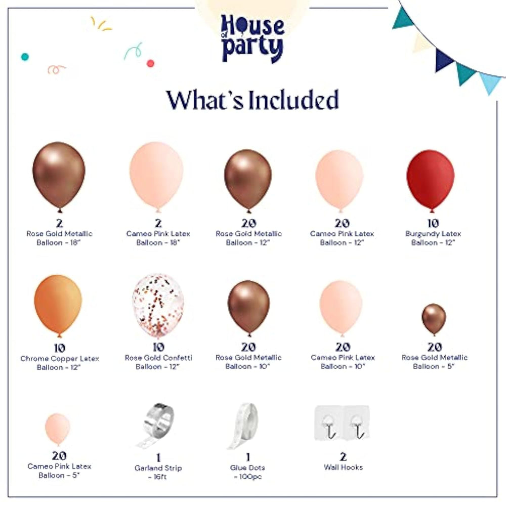This balloon arch kit features chrome copper, rose gold, burgundy, and cameo pink balloons in various sizes, perfect for creating stunning backdrops, centerpieces, and entryways for birthdays, baby showers, and other celebrations. Made from durable, eco-friendly, non-toxic latex, the balloons are long-lasting, hold air well, and resist deflation or bursting, ensuring a vibrant and safe decoration for children and guests.
