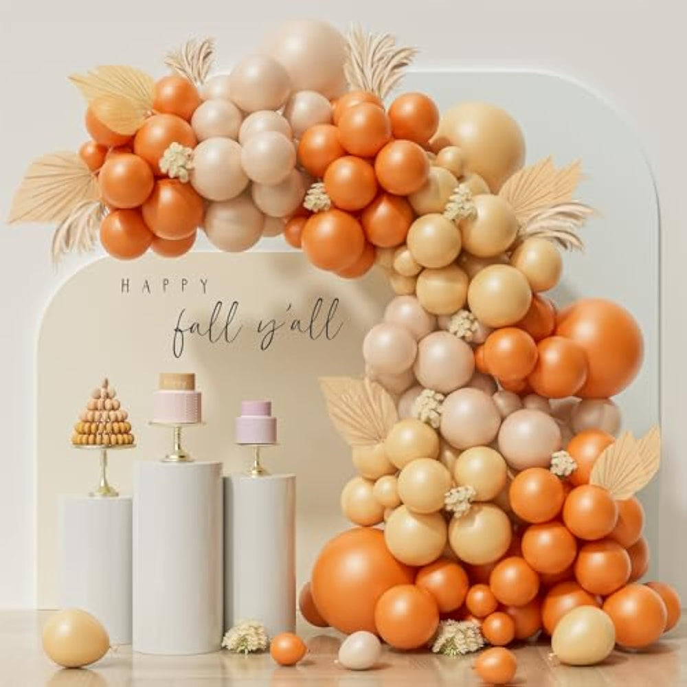 Create a stunning autumn display with this 138pcs Burnt Orange Double-Stuffed Balloon Garland Arch Kit, featuring 134 latex balloons in burnt orange, cream, peach, and apricot, along with a balloon arch strip, ribbon, 100 glue dots, and easy-to-follow instructions. Made from high-quality natural latex, these balloons are thick, flexible, and long-lasting, resisting bursts and maintaining their shape for at least a week. Perfect for a wide range of occasions—fall baby showers, pumpkin-themed birthday parties, “Here Comes the Sun” baby showers, bridal showers, boho weddings, Halloween, Thanksgiving, and other indoor or outdoor autumn celebrations. The DIY kit includes all necessary tools, making assembly quick and simple, even for beginners, and allows you to display your balloon garland on walls, doorways, tables, or trees. For a bigger, more impressive look, combine two or more kits.