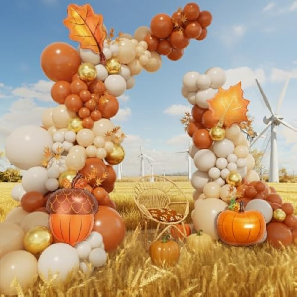 Celebrate autumn in style with our Fall Balloon Arch Kit, perfect for baby showers, Thanksgiving, and other seasonal gatherings. This all-in-one set includes a mix of light orange, burnt orange, white sand, and metallic gold latex balloons, plus extra-large 22-inch reusable foil balloons in festive shapes like acorn, leaf, pumpkin, and maple leaf (straw not included). The kit comes complete with everything you need—balloon strip, glue, and ribbon—for effortless assembly and a stunning display. Designed for durability and vibrant seasonal colors, it brings cozy, festive charm to any event. Keep balloons away from heat and avoid overinflation for best results.