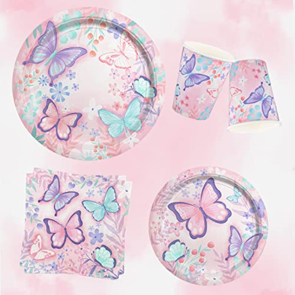 | Butterfly Package Including: 16*Dinner Paper Plates (9 Inches), 16*Dessert Paper Plates (7Inches), 16*Napkins, 16*Paper Cups (9Oz). | | Lovely Designs: This Series Party Supplies Is Designed With Butterfly. The Round Paper Plates Have Pastel Blue, Pink, And Purple Butterflies And Blooms On A Pink Watercolor-Style Background. | | Great For Kid’S Birthday Party : This Party Pack Is Attractive And Exquisite That It’S Designed With Butterfly Themed. You Can Easily Create A Dynamic Party Atmosphere. | | Eco-Friendly Durable Party Tableware: The Disposable Paper Plates, Cups And Napkins Made Of Thick Paper Material And Are All Printed With Food Grade Water-Based Ink Which Is Suitable For Food