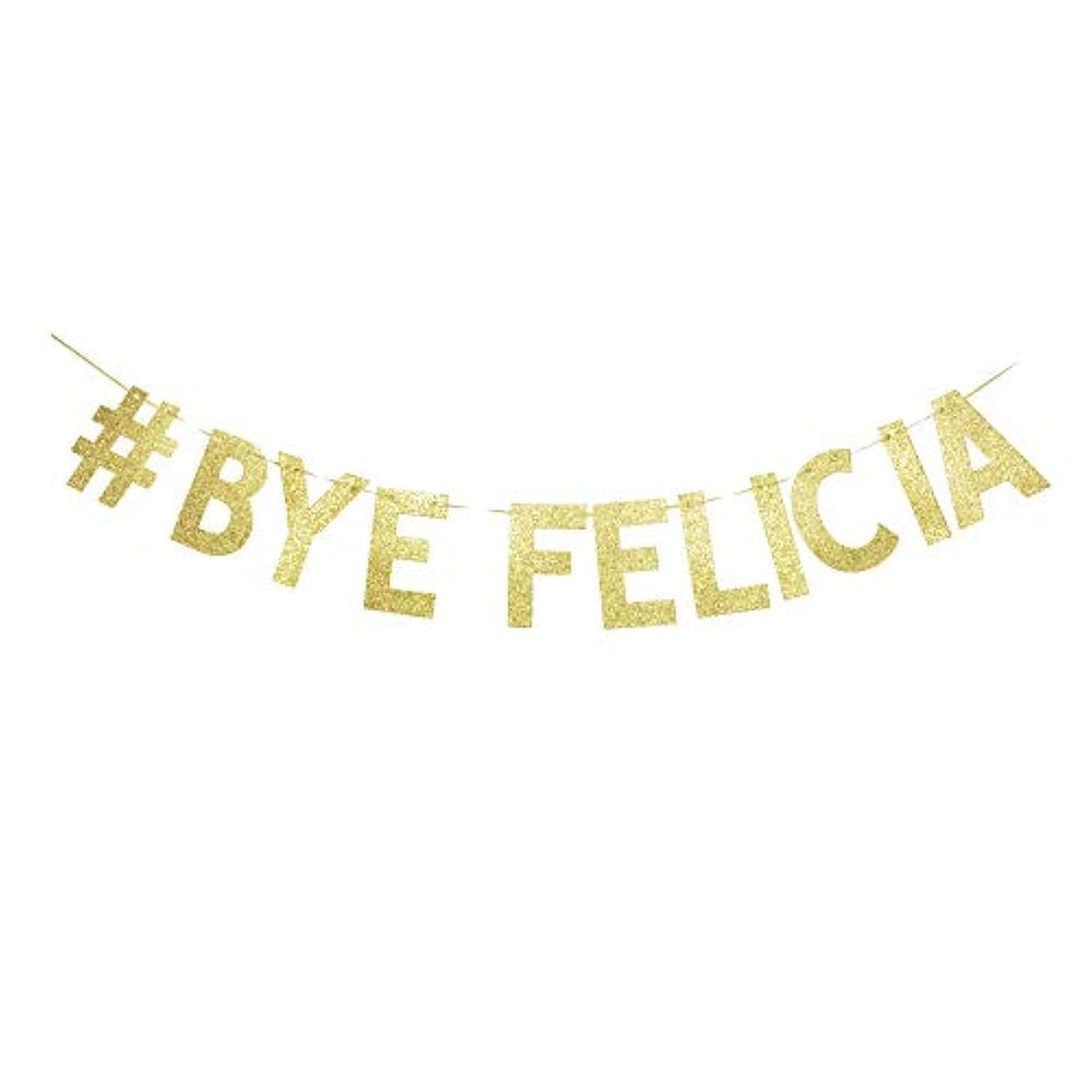 | Bye Felicia Banner, Shiny Gold Gliter Paper, High Quality And Elegant. | | Package Include 11Pcs Of Letters And 1Pc Of String. | | Assembly Needed, String Through The Pre-Cut Hole Of Each Letters And Creat The Banner. | | Perfect For Graduation/Farewell/Moving/Job Change/Goodbye Party Decorations/Sign Photoprops Decors. | |