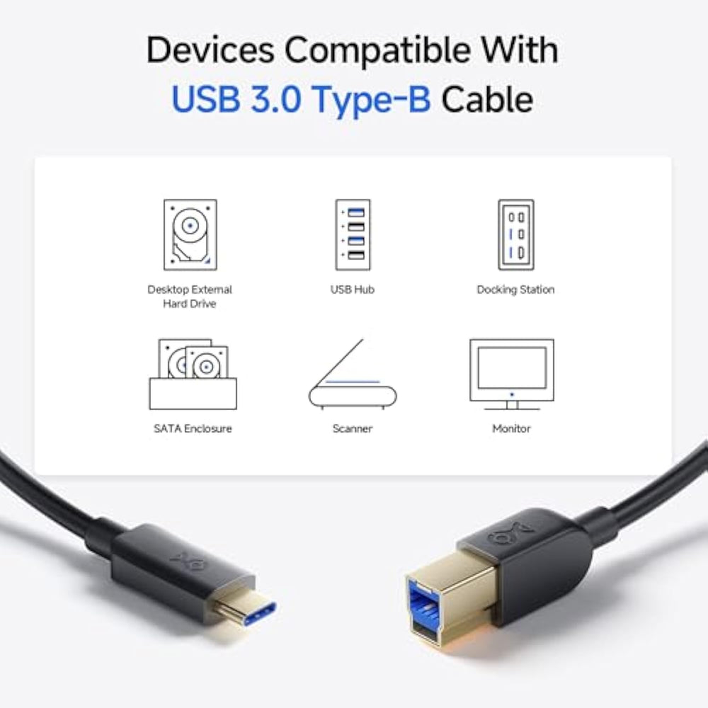 | USB Type C to USB Type B Cable: Connects a computer with a USB Type-C port to an external hard drive, docking station, or USB switch with a USB Type-B 3.0 port. Compatible with popular devices including the 2015 MacBook, Google Chromebook Pixel, HP Spectre x2, Pavilion x2, Yoga 900 (13-inch), Zen AiO PC, and other devices with a USB 3.1 Type-C or Thunderbolt 3 port. | | High-Speed Data Transfer: This USB C to USB B 3.0 cable supports data transfer speeds up to 5 Gbps, making it a reliable solution for connecting your USB Type-C laptop to a legacy USB-B 3.0 peripheral like external hard drives or docking stations. | | Easy to Use, Reversible USB-C Connector: The low-profile, reversible USB Type-C connector of the USB B 3.0 to C cable ensures a snug, secure connection. Clicks into place for easy data transfer from USB-C devices to devices with USB Type-B 3.0 ports, providing reliable use with no hassle. | | Durable and Flexible Construction: Built to last with a flexible PVC jacket, rugged construction, and molded strain relief for frequent unplugging. The USB C to USB B 3.0 cable is fully shielded to minimize EMI/RFI noise, ensuring superior transmission performance. | | and Support: Purchase with confidence—this USB 3.0 Type-B to USB-C cable is backed by a and product support, providing peace of mind for all your connectivity needs. | |