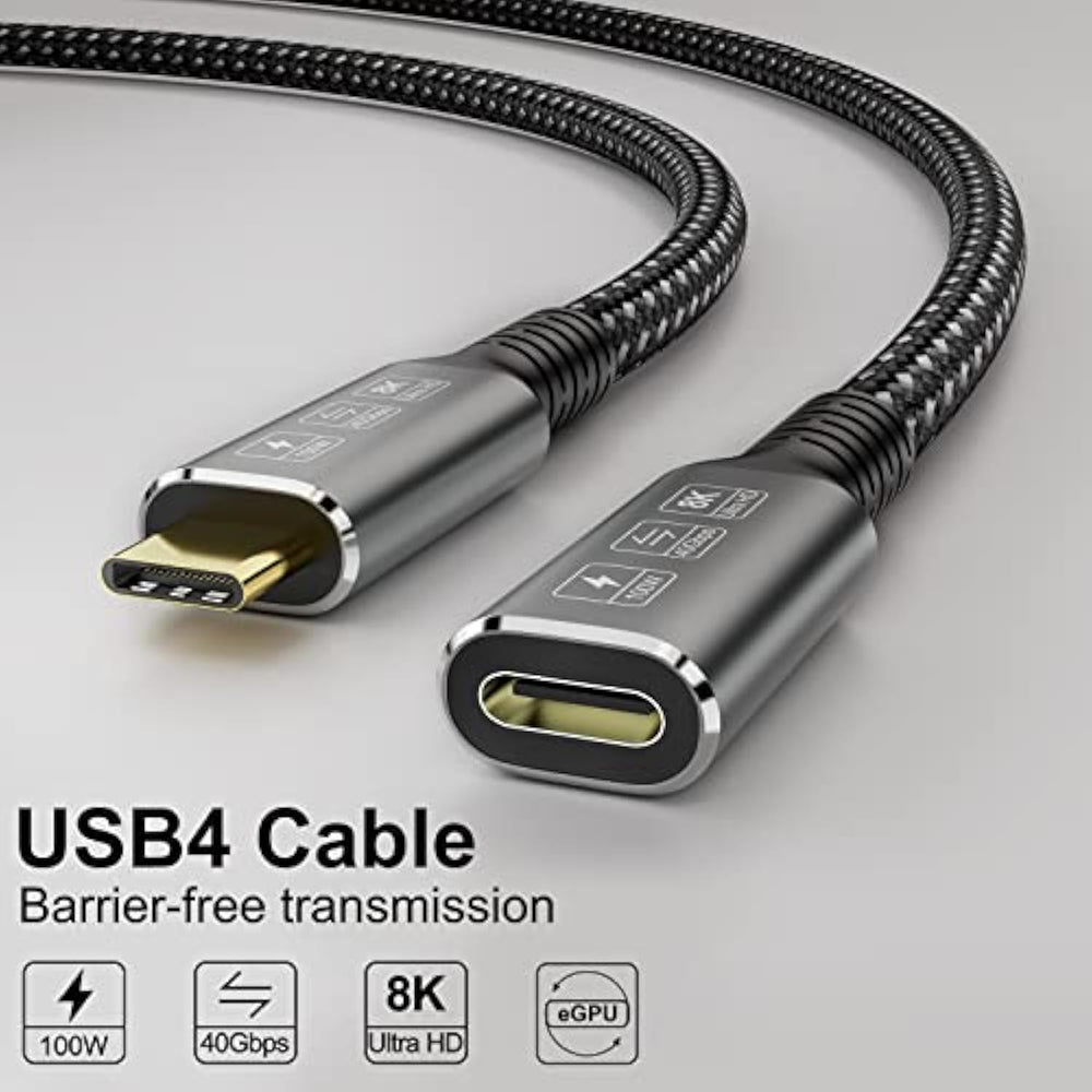 | USB4 Ultra 8K Video Extension Cable,This USB4 Male to Female Cable enable you to connect from your Laptops with USB-C Port(DP Alternate Mode for video supported)to your External Monitors with USB-C Port,you need to connect an external USB4 Male/Male cable for connection to your laptops or Displays,M/M USB-4 Cable is not included in our Package | | USB4.0 Max 40Gbps Data Transfer Rate:This USB4 Cable can Reach Data Transfer Rate up to 40Gbps,the transmissions speed is twice as fast as Thunderbolt 3.When you are transmitting data, your data transmission equipment needs to support 40Gbps, and your own data can reach 40Gbps, otherwise the data transmission rate will not be reached | | Practical 100W Power Delivery Charging:This CABLEDECONN's USB 4 Cable can support Max 100W 20V/5A Charging,It will supply power when your USB-C device is in use.In order to ensure faster power supply, please use the original adapter that matches your device | | Easy and Conveient to use,durable Design:This USB 4 Cable with Gold-plated Connector,Sturdy Aluminum Shell,Braided Nylon,USB4 Male to Female Extension Cable solve the problem that some of your device's Male to Male Cable is too short,Barrier-free, No distance Connection and Transmission | | Wide Compatibility:This USB4 Type-C Cable is widely compatible with Most of USB-C Devices(Mainly Laptops),Such as Macbook Pro 2021 2020,2019,2018,Dell XPS,Google Pixel, ChromeBook and other DP Alternated Mode Supported Devices,backward compatible with Thunderbolt 3, You can also connect with Hard Drivers/USB-C Hub/Docking/eGPU for Data | |