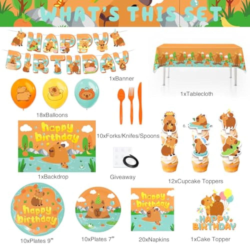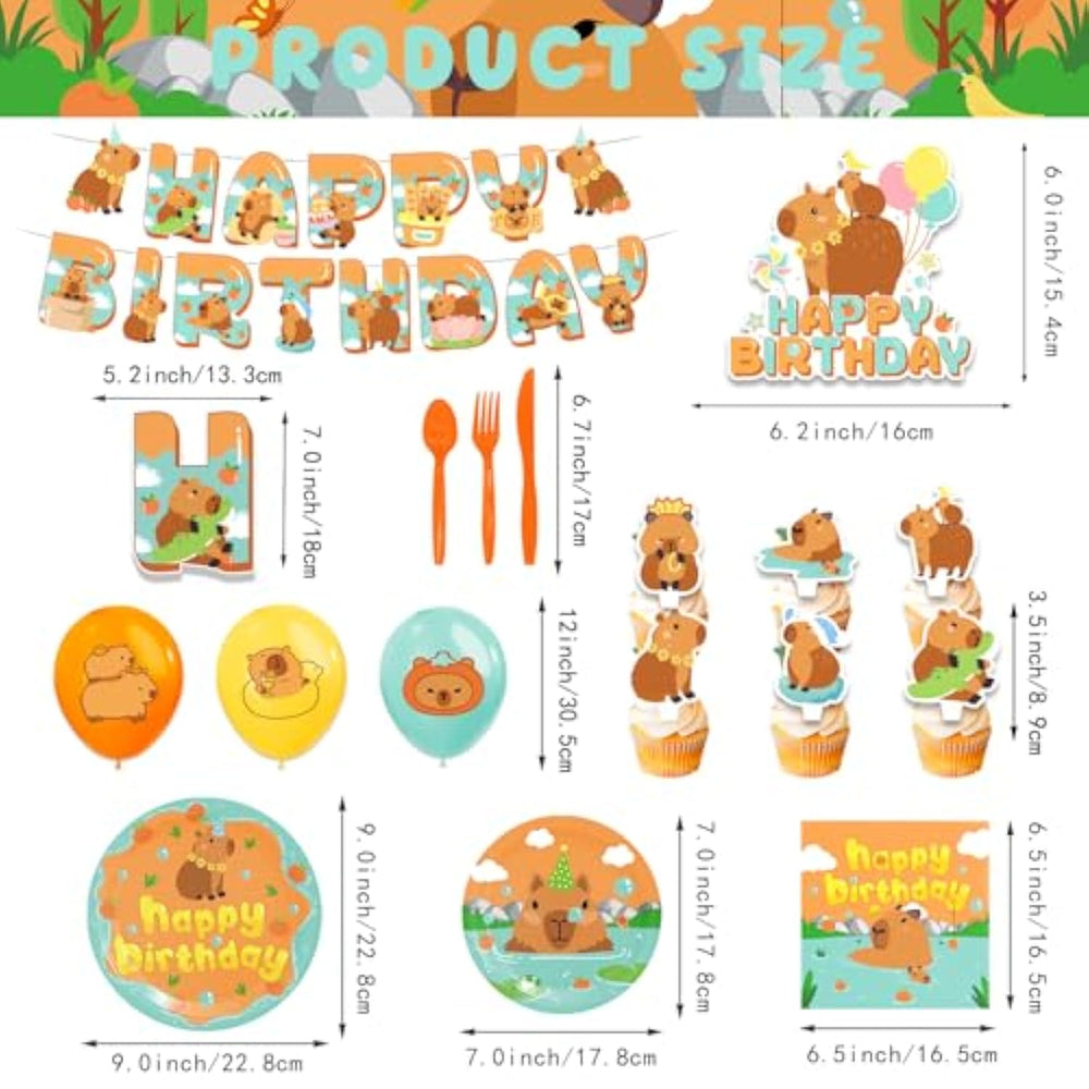 | ???Products Include :? 1 Happy Birthday Banner,1 Capybara Backdrop,18 Colored Balloons, 1 Capybara Tablecloth, 10 9-Inch Plates, 10 7-Inch Plates, 10 Forks And Spoons Each, 1 Happy Birthday Cake Toppers, 12 Capybara Cupcake Toppers. | | ???3D High-Definition Printing:? Using 3D High-Definition Printing Equipment, The Product Is Bright And Clear Without Fading | | ???Material Safety: ?The Materials Used In The Product Have Passed The Environmental Protection Certification, Which Is Harmless To The Human Body And Has No Peculiar Smell. | | ???Easy To Assemble:? Easy To Assemble And Equipped With Relevant Accessories Required For Assembly. | | ???Save Time And Worry:? This Product Belongs To A Set, Which Contains The Items You Need For Your Party, You Don'T Need To Buy It Separately And Assemble It Yourself, Saving Time, Worry And Money | |