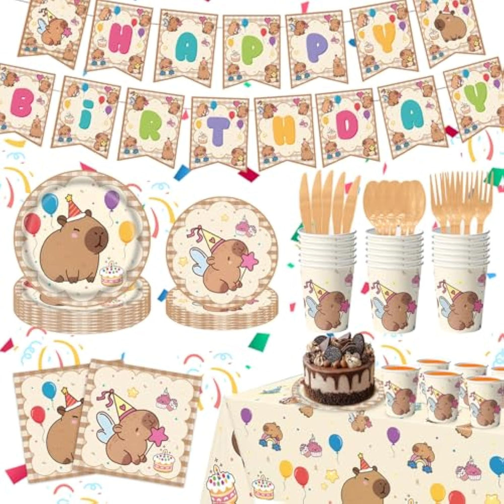 | Complete Capybara Birthday Decorations Set For 24 Guests:This 170-Piece Capybara Birthday Decorations Set Includes 24 7-Inch Plates, 24 9-Inch Plates, 24 Cups, 24 Napkins, 24 Forks, 24 Knives, 24 Spoons, 1 Large Tablecloth (108 X 54 In), And 1 Adorable Birthday Banner. | | Charming Capybara Birthday Design:Capybara Birthday Featuring Party-Ready Capybaras Holding Cupcakes, Balloons, Stars, And Gifts—This Cozy Cartoon Theme Is Perfect For Children Who Love Capybara Party Supplies With Personality. | | Easy Setup – No Assembly Required: Capybara Party Decorations All Items Come Fully Printed And Ready To Use. Just Unpack And Start Decorating Your Capybara Birthday Party In Minutes! | | Durable And Disposable Materials:All Paper And Plastic Components Are Food-Grade And Sturdy—Ideal For Indoor Playrooms Or Backyard Capybara Party Decorations.Capybara Birthday Decorations | | Perfect For Many Occasions:Suitable For Various Settings Such As Capybara Birthday Parties, Capybara Photo Wall Decorations, Baby Showers, Classrooms, Outdoor Picnics, Room Decorations, And Even As Adorable Photography Props. This Versatile Capybara Party Set Adds Charm Wherever It’S Used.Capybara Birthday Decorations | |