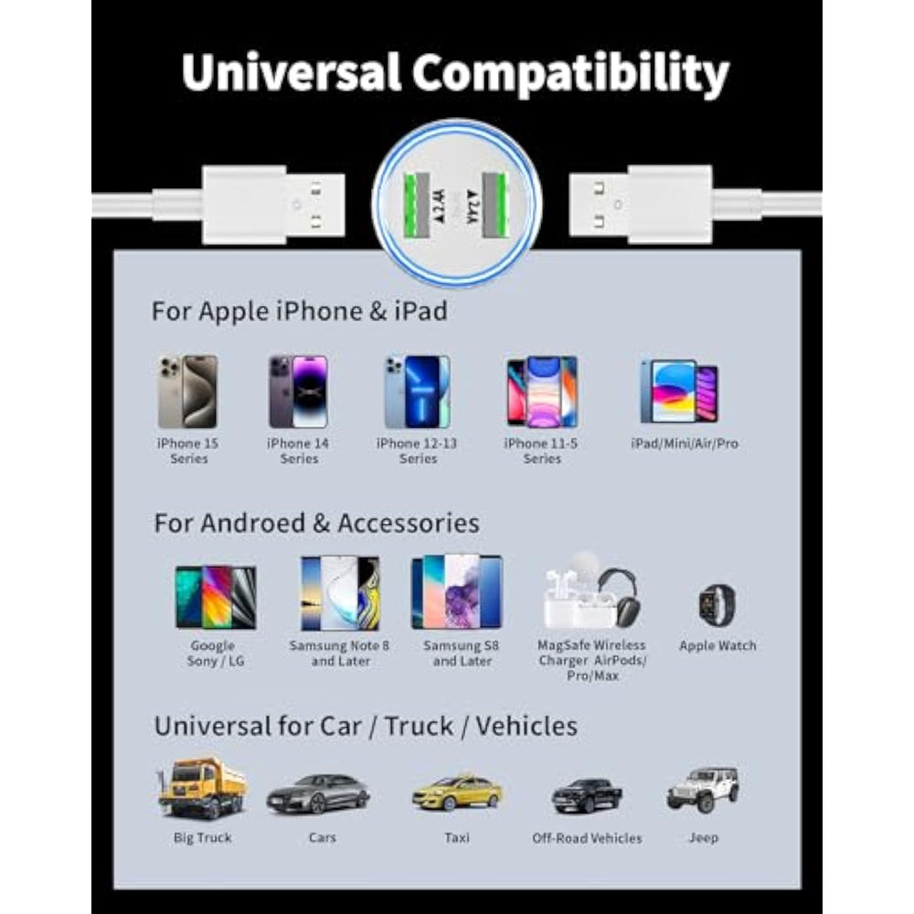 4.8A/24W Efficient Charging: Car Charger Can Reach Maximum Output Of 2.4A/12W Per Port, Which The Charging Speed Is 2X Faster Than 1A/5W. Twin Usb-A Ports Pump Out A Combined 24Wâ—Enough To Provide A Full-Speed Charge To 2 Phones At Once. Please Note: This Dual Usb Cigarette Lighter Adapter Is Not Compatible With Qualcomm Quick Charge. The Charging Page Will Not Show Fast Charge When Charging. It'S Perfect Fits In The Auto Vehicle Cigarette Lighter Usb Charger Spot Socket. | | Ultra-Compact: The Car Charger'S Super-Small Design Saves Space And Allows Seamless Access To The Rest Of Your Dashboard. The Usb Car Charger'S Tiny, Thumb-Sized Body Fits Perfectly And Snugly Into Most Cigarette Lighters, Freeing Up More Space And Giving You A Comfortable Aesthetic. It'S Our Smallest Car Charger Yet, Lightweight And Highly Portable So You Can Take It Anywhere. The Ridged End Allows Instant, Struggle-Free Plugging And Unplugging | | All Metal, Won'T Heat: The Full Aluminum Alloy All.