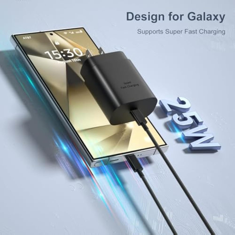 | Dual Port Usb C Car Charger: The Usb C Charger Simultaneously Charging 2 Devices, Combined Two Way Charging: Usb And Usb C In One Plug, Which Is Convenient For Charging 2 Phones Or Connecting A Dash Cam In Car. | | 25W Usb C Fast Charger: Usb C Fast Charger Can Provide 25W (Max) Strong Power To Charge Your Galaxy Phones. Based On The Latest Super Fast Charging Technology, It Shortens The Charging Time To 30 Minutes, Gets Your Phone Charging From 0 To 50% Battery. | | 6Ft C Type Charger Cable: Compared With Normal Pvc/Tpe Material Usb C Cables, Ours Is Covered By Braided Nylon, Make It Stronger And Tangle-Free. It’S More Suitable For Family Have Pets. You Would No Longer Sitting In An Uncomfortable Position Because Of The Short Cables, You Can Lie On The Sofa And Sit Wherever You Want While Charging. | | Super Fast Charger Set For Galaxy: This Fast Charging Set Includes 1 X 25 Watt Usb C Charger,1 X Dual Port Car Charger, 2 X 6Ft Braided Usb C To Usb C Cable, Which Is Handy For Different Occasions.Each Charging Block From Is Strictly Tested Before Delivery And Provides Premium Performance, Thus You Can Purchase It With Confidence And We Will Stand Behind Our Products. | | Broad Compatibility: It’S Compatible With Galaxy S25 Ultra, S25+, S25, S24 Ultra, S24+, S24, S23 Ultra, S23+, S23, 22 Ultra, S22+, S22, S21 Fe, S20, A15, A16, A06, A54, A53, A14, A23, Note20, Note10, Also Works For Iphone 15,Ipad Pro, Pixel 7,6,5,4 And More Android Phones/Tables. | |
