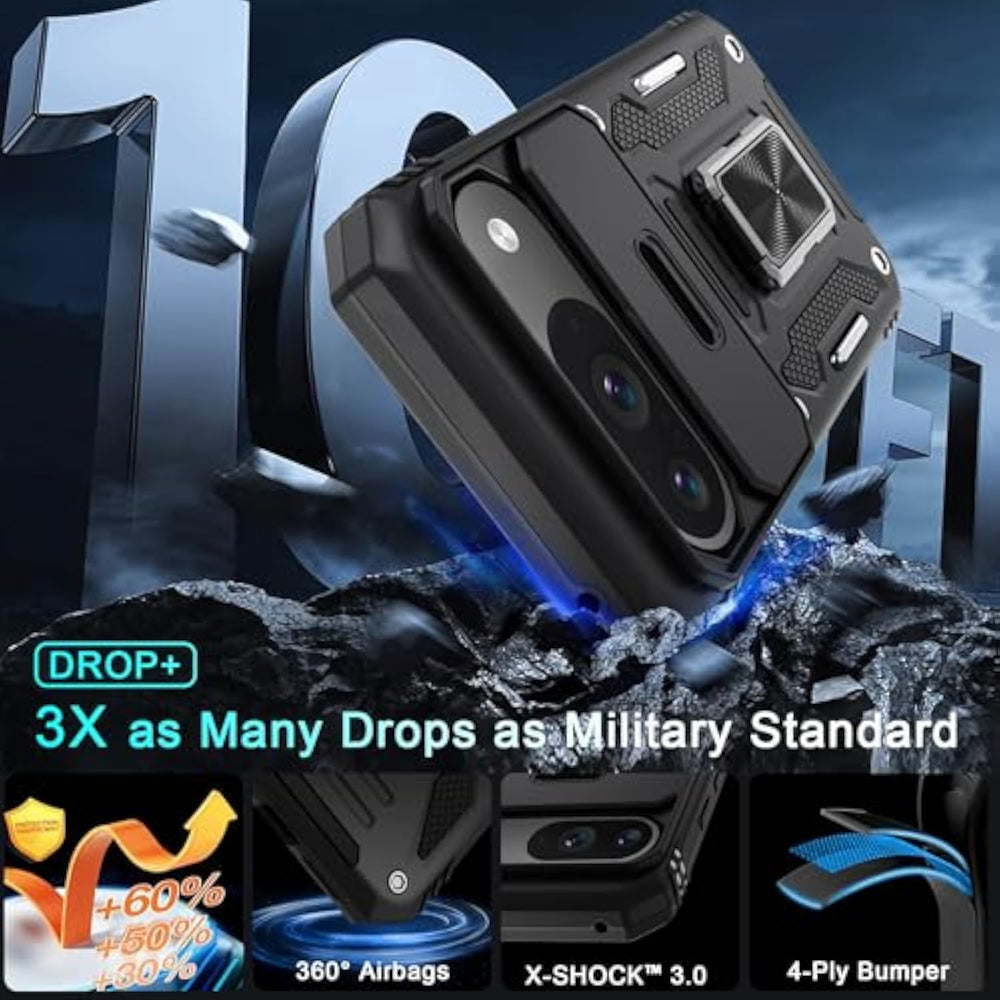 | Compatible With: Armor Case With Sliding Camera Cover Specially Designed For Google Pixel 9, For Google Pixel 9 Pro. Not Fit For Other Device! The Precise Cut Out Fits Each Button,Camera,Speakers And Ports Precisely, Easy To Press And Access | | Military Grade Protection: Double Layer Shockproof Case Made By Tpu And Pc.This Multi Layer Cushion Structure Provide Additional Shock Absorption Protection.Certified By The Military Standard,Survived Over 8,000 Drop Tests From Up To 8Ft!The Flexible Tpu Interior Absorbs Impacts From Inside.In Addition,Exterior With Four Reinforced Corners Can Effectively Absorb The Impact Of Falling | | Camera And Screen Protection: Sliding Camera Cover Protect For Your Camera Lens From Getting Scratched And Scuffed.Subtly Enhanced 1.8 Mm Screen Lips And Glass Screen Protector Provide The Screen Extra And Comprehensive Protection.Ensuring Every Aspect Of Your Phone Is Protected With Uniquely | | Magnetic Ring Kickstand: Newly Upgraded Multi Function Case Built In Ring Kickstand And Metal Patch.Rotating Ring Provide Two Stand Modes For Vertical Horizontal Viewing,So It Can Be Used As Ring Holder And Release Your Hand When Watching Video.The Metal Patch Back Easily Attach To Magnetic Car Mount,Very Convenient During Driving Time For Navigation.You Will Love How Convenient It Is With Such Powerful Functions | | What'S In The Package: The Package Come With 1 Pack Phone Case,1 Pack Tempered Glass Screen Protector And 1 Pack Cleaning Kit. Notice: Due To The Metal Ring On The Back,The Case Will Not Work With Wireless Charging Function Directly | |